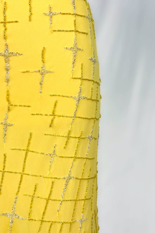 GOLDEN STARBURST EMBELLISHED SILK YELLOW MIDI DRESS
