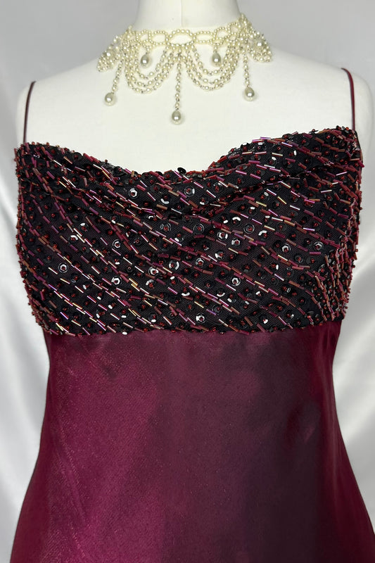 BURGUNDY IRIDESCENT EMBELLISHED COWL MAXI DRESS