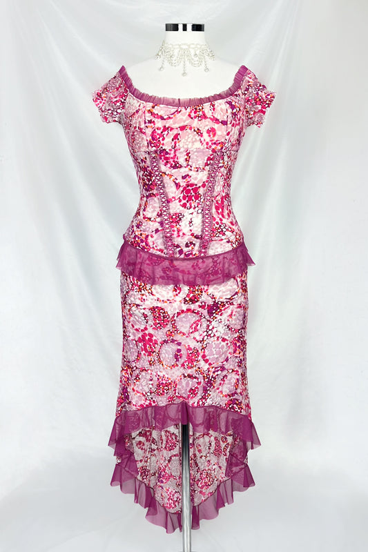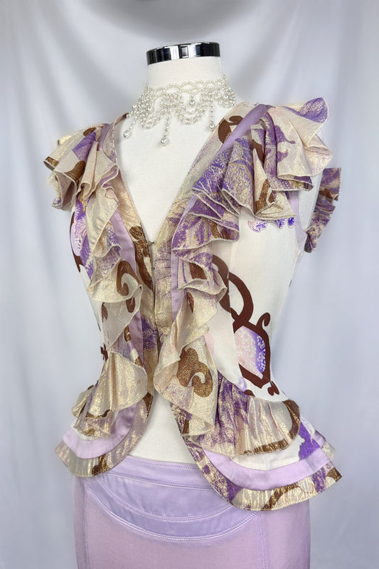 VINTAGE 00s ROBERTO CAVALLI LILAC GOLD RUFFLE PEPLUM TOP & SKIRT SET