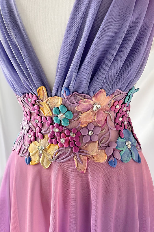 IRIDESCENT DUSK FLORAL EMBELLISHED ASYMMETRICAL MIDI DRESS