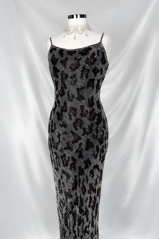 STEEL GREY LEOPARD FANTASY EMBELLISHED SILK GOWN