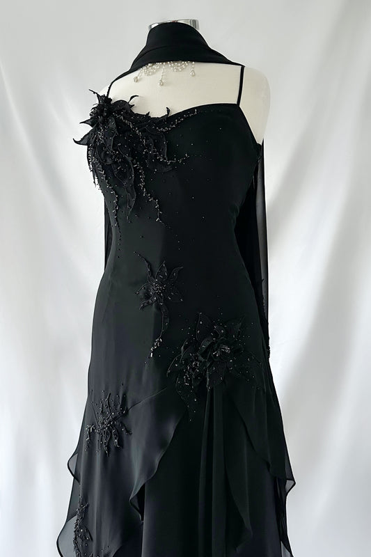 NOIR FLOWER EMBELLISHED ASYMMETRICAL DRESS & SCARF SET