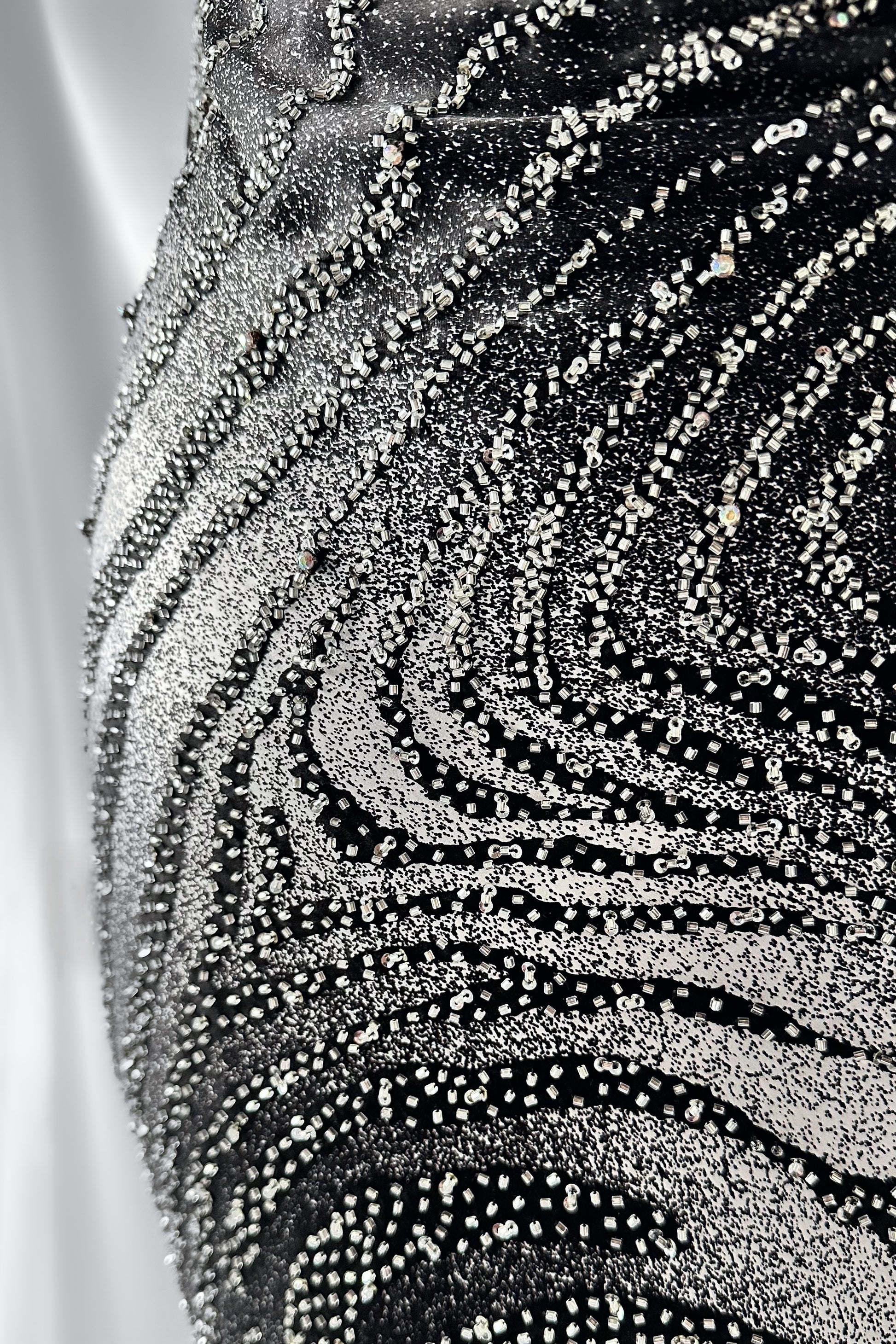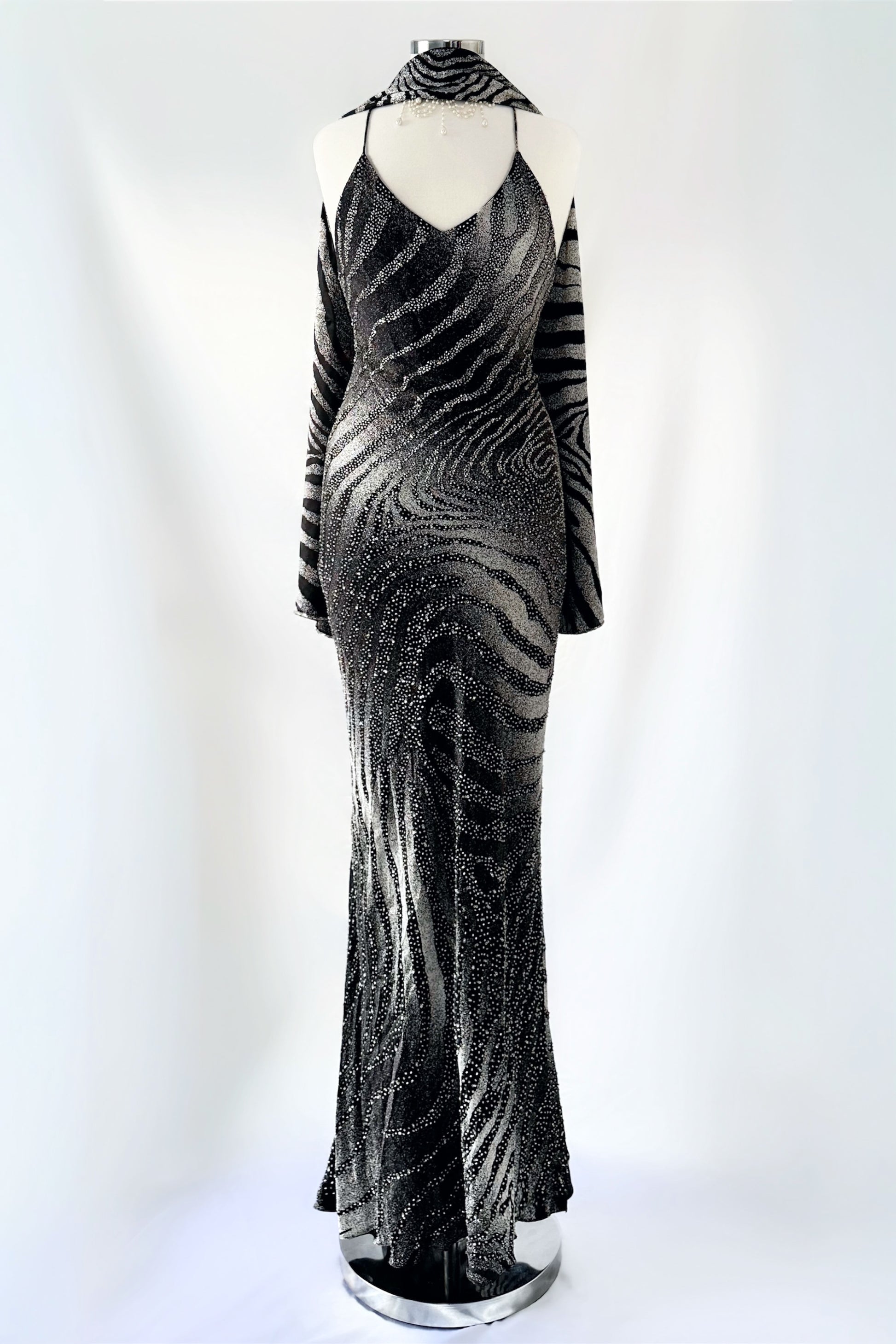 This zebra-pattern silk gown glitters with thousands of hand-placed beads that sweep across the body in fluid, hypnotic waves. The slinky halter neckline, open back and floor-skimming cut sculpt a long, elegant silhouette, while the detachable draped sleeves add that dramatic, red-carpet edge. A true show-stopper for the woman who wants every detail to shimmer.