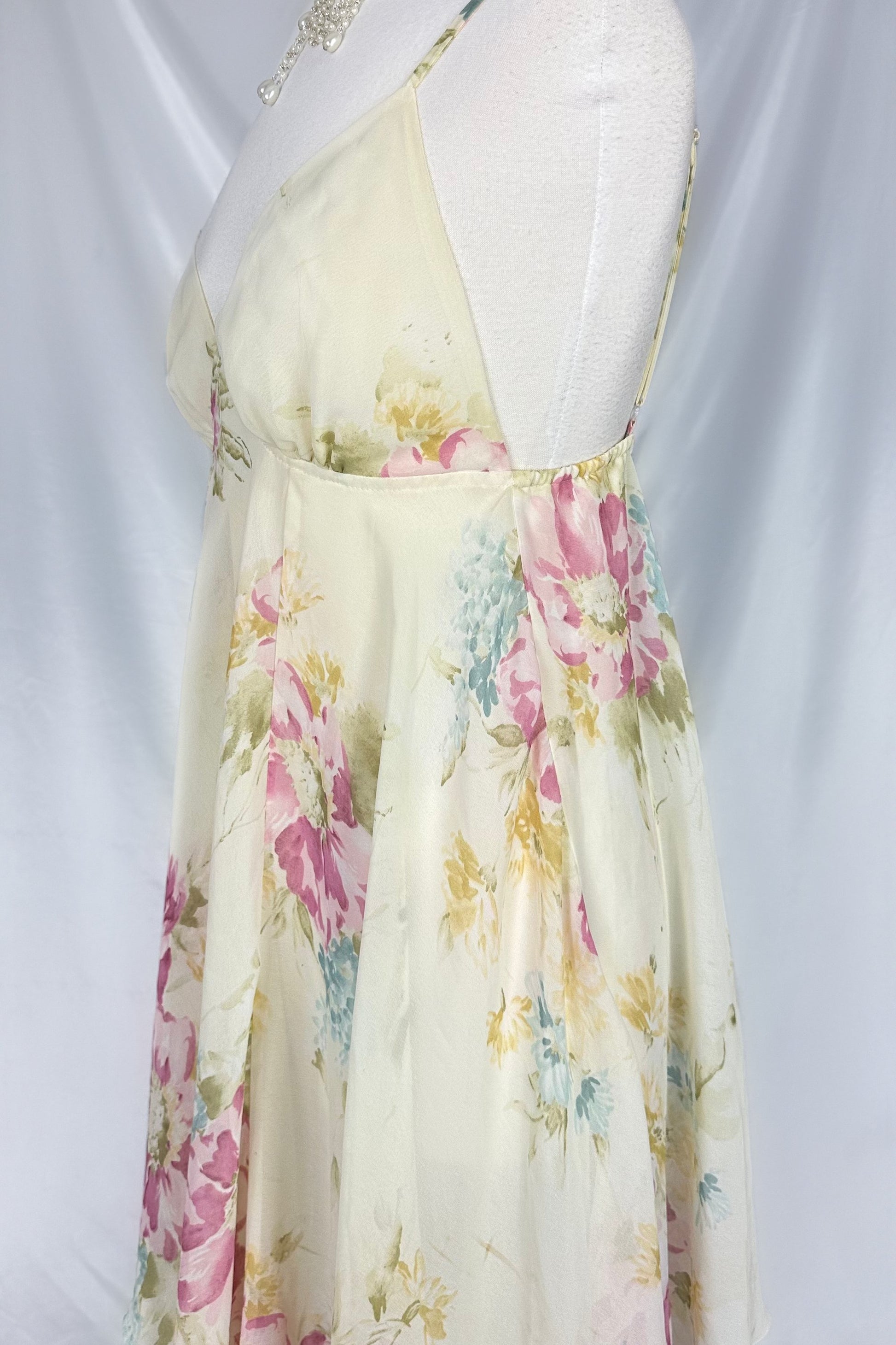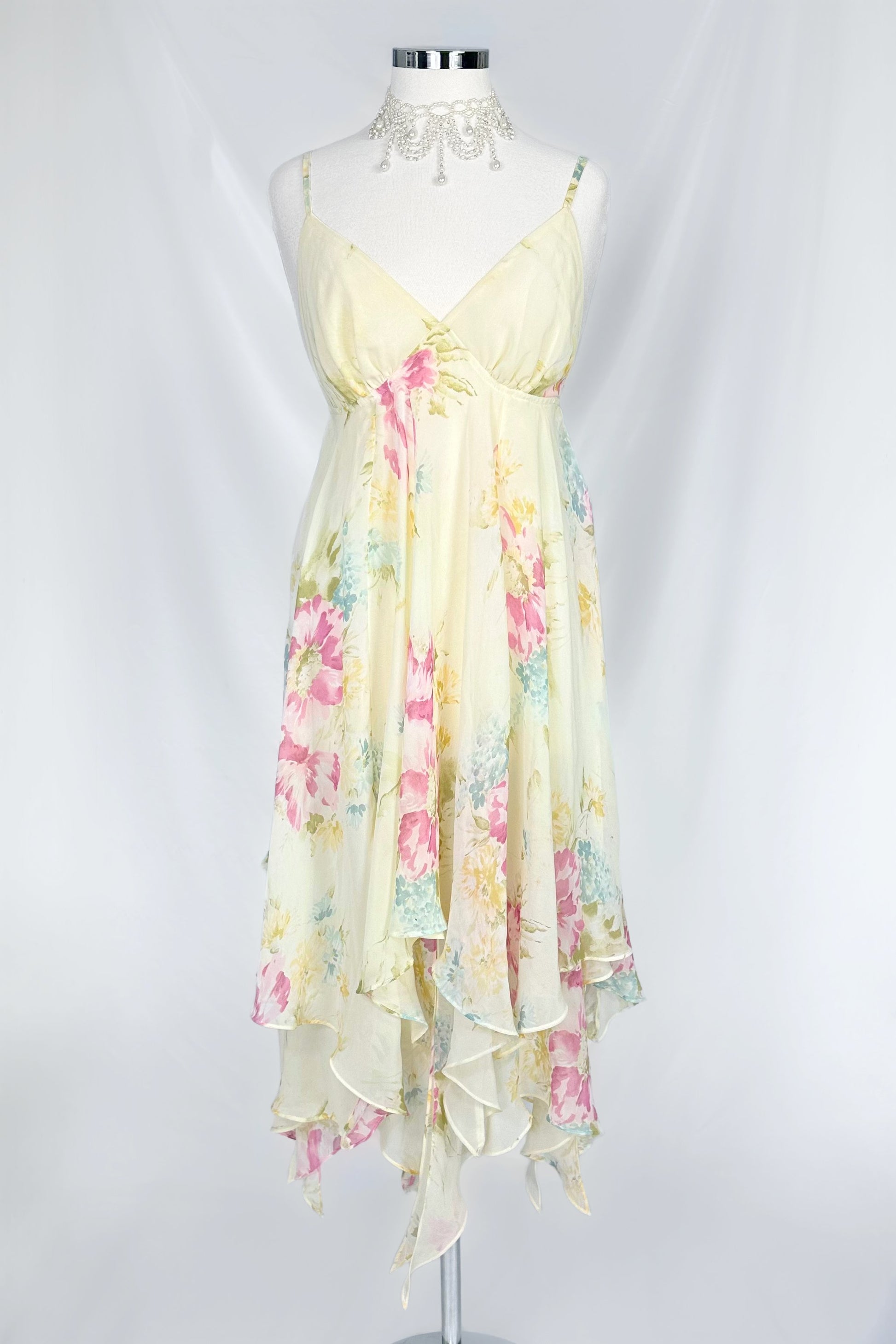 A true collectors piece, a rare summery midi from 90s Victoria Secret. This pastel floral midi floats with every step, featuring a flattering V-neck bust, delicate straps, and a cascading handkerchief hem that moves beautifully. The print blends blush pinks, buttercream yellows, and soft aqua tones, giving the dress that effortlessly feminine, fairy-garden energy your customers love. Lightweight, airy, and perfect for summer dates, garden parties, or holiday evenings.