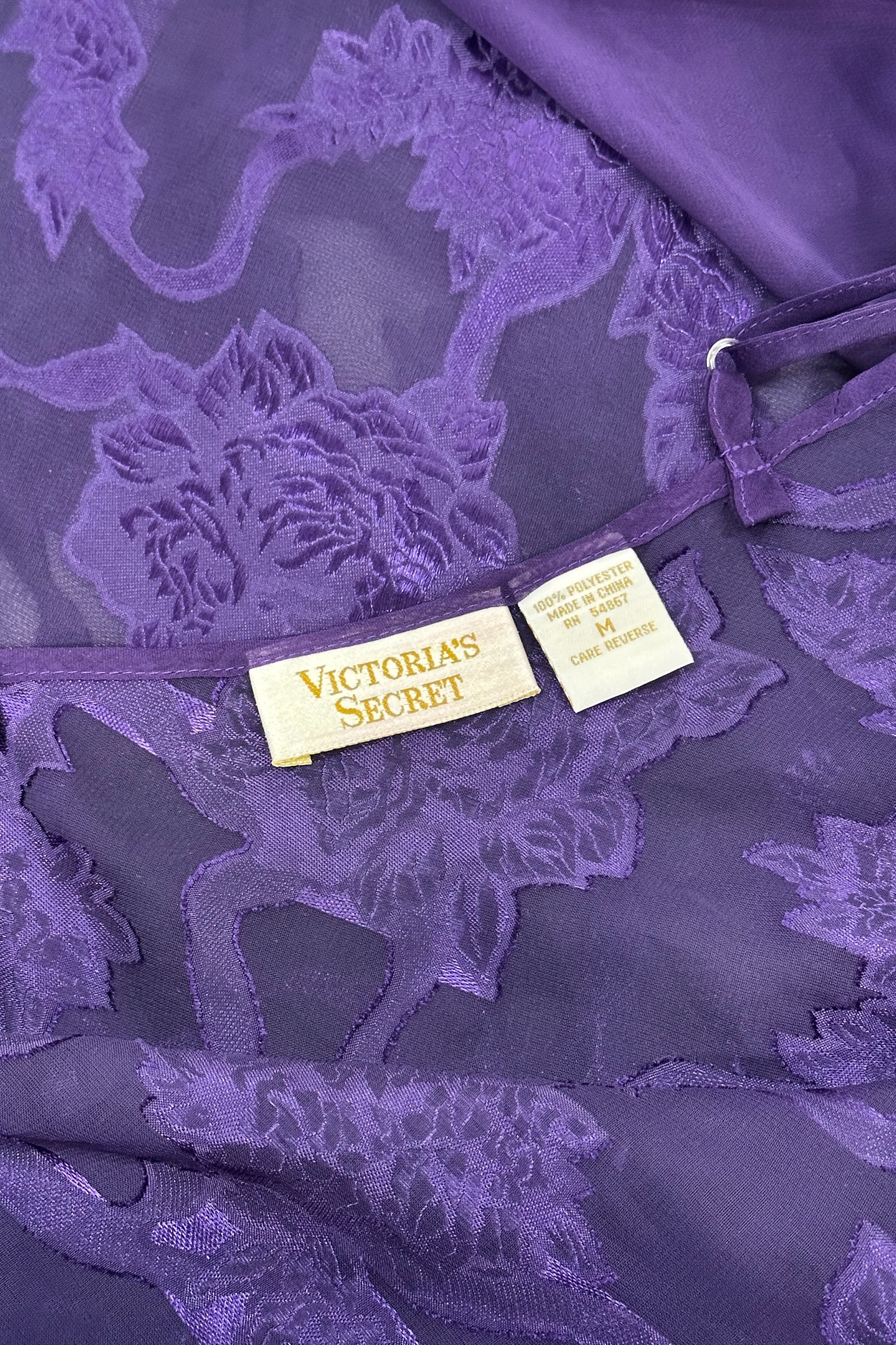 An authentic 1980s Victoria’s Secret treasure, this sheer amethyst mesh dress is adorned with intricate embroidered florals that sculpt and flatter the silhouette, balanced by delicate straps and a softly draped neckline for an effortlessly sultry finish. The asymmetric chiffon cascade adds fluid movement and drama, capturing the romantic, lingerie-meets-glamour aesthetic of Victoria’s Secret’s early era. Rare, collectible, and undeniably captivating