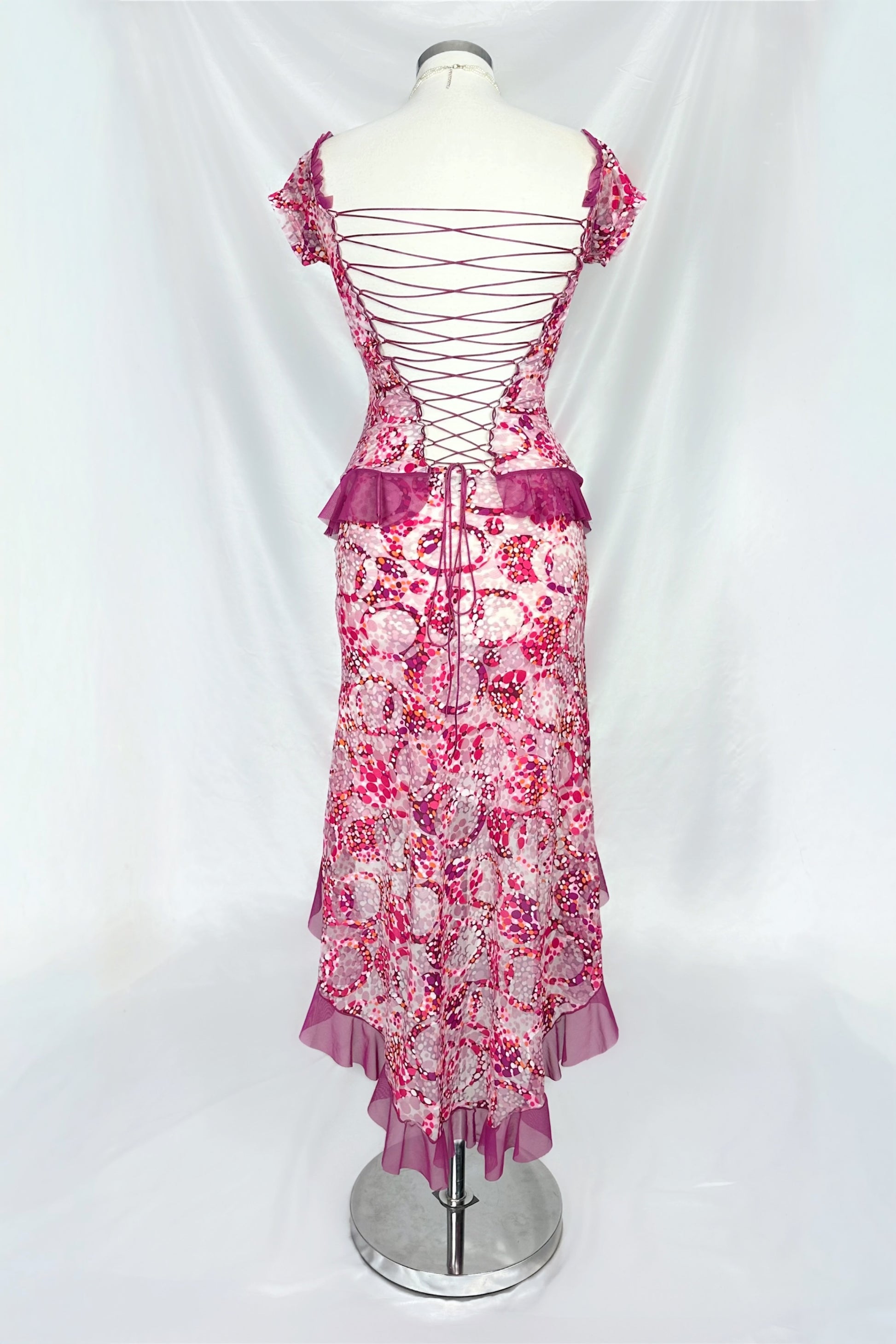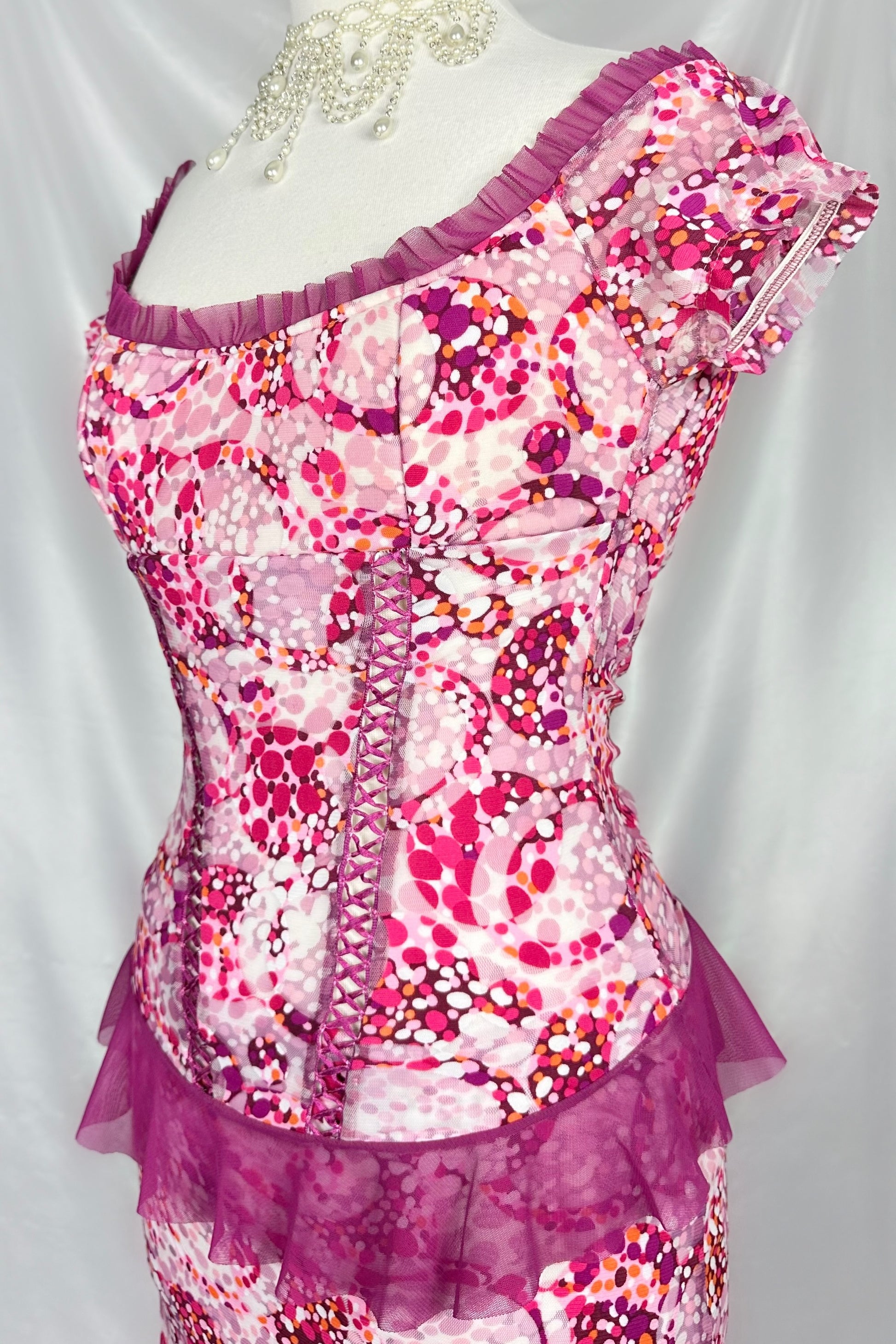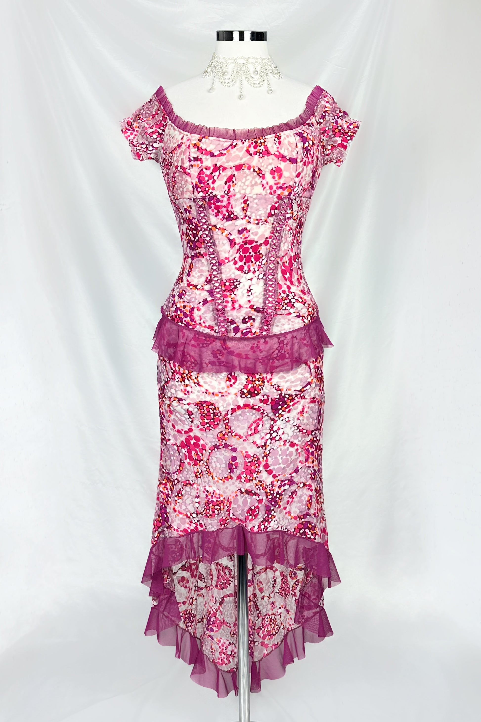 This adorable ensemble features a cute ditsy spring flower pop design that is both playful and stylish. The stretchy fabric ensures a comfortable fit while the fuchsia purple mesh tulle trims add a touch of femininity and charm. The corset top boasts an open self-tie able back, cinching in your waist and accentuating your figure with a flattering bust line. Paired with the midaxi skirt, which includes an elasticated waistband for easy wear.