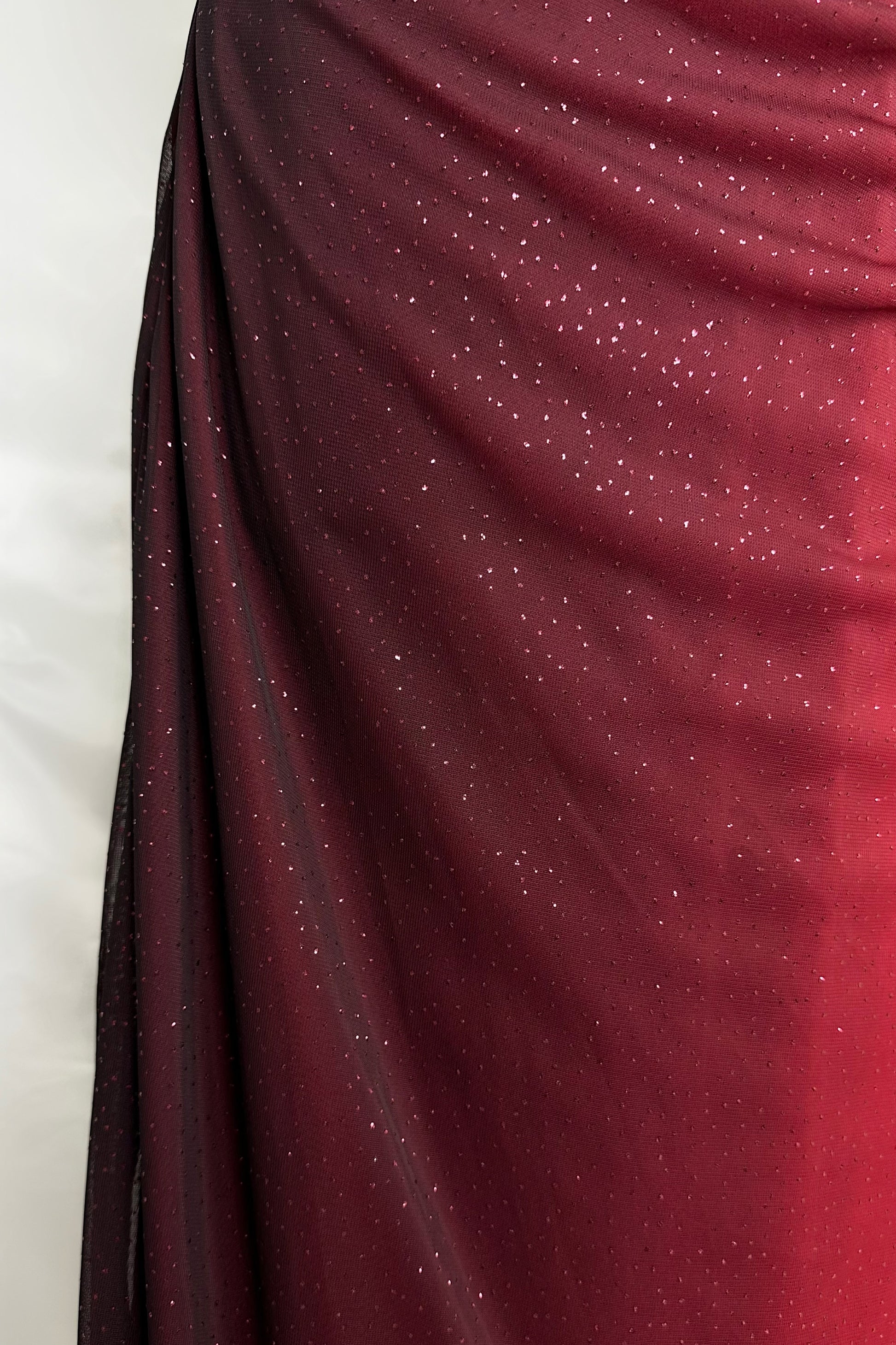 Unveil a timeless elegance with this radiant garnet red gown. Featuring a mesmerising halter neckline adorned with a rhinestone accent, this dress flows with layers of glittering fabric, creating a luminous silhouette. A gorgeous ombré transition of a rich burnt burgundy to soft ruby. The ruched bodice and cascading side drape add a touch of glamour, perfect for enchanting every room you enter. A show-stopping choice for evening soirées or formal events.