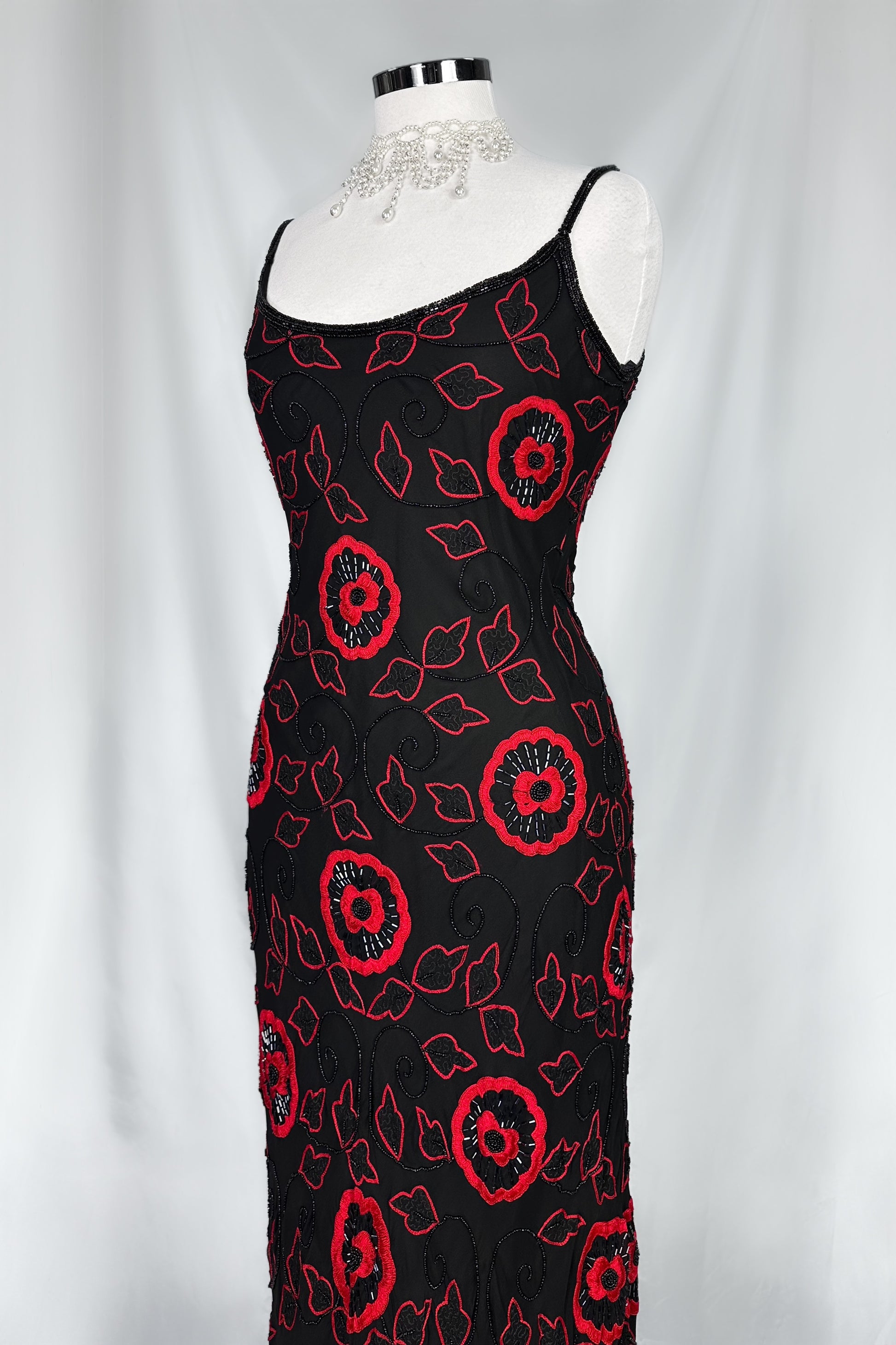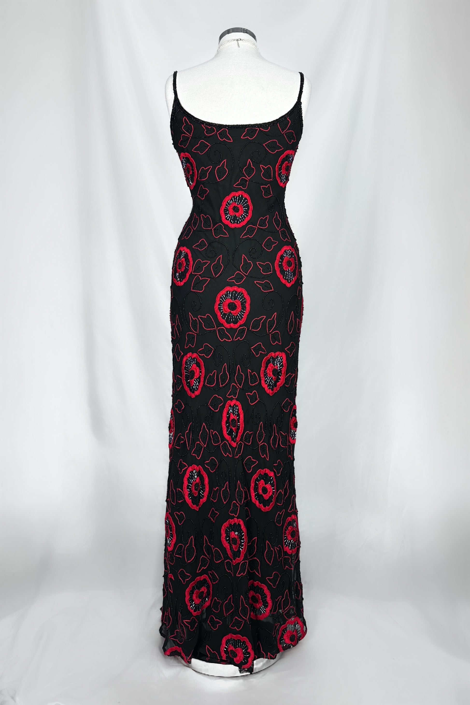 A silhouette that speaks before you do. This sultry black silk gown is adorned with vivid scarlet floral embroidery and intricate beaded detailing that catches the light with every step. Cut with delicate straps and a softly sculpted neckline, it skims the body for an effortlessly elongated shape. Bold, romantic, and unapologetically striking.