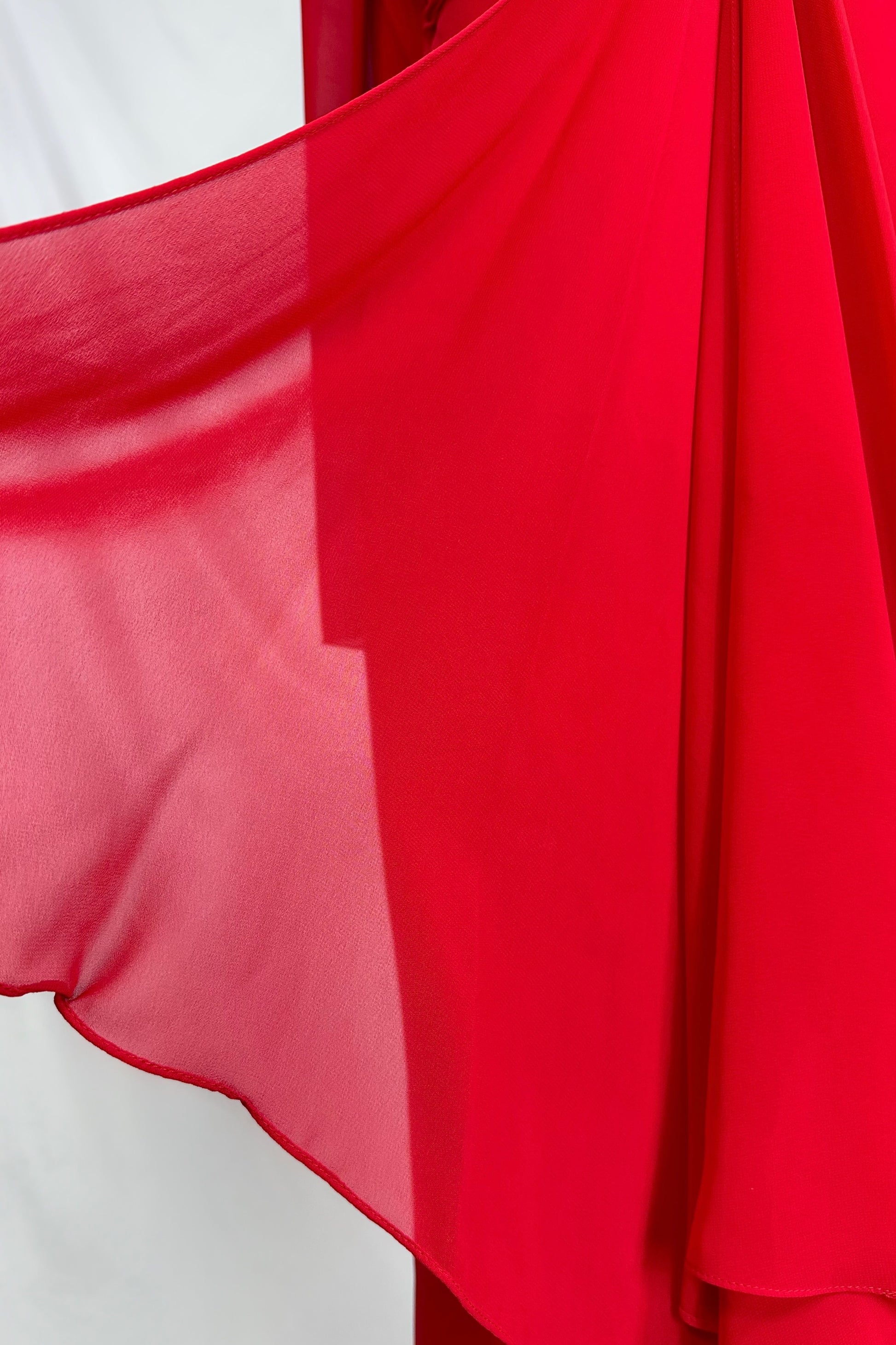 A head-turning statement in crimson red, this gown exudes a sultry elegance with its draped chiffon bodice and sculpted knot detail that accentuates the waist. The flowing silhouette cascades effortlessly, while the sheer matching shawl adds a touch of timeless glamour. Finished with delicate spaghetti straps and a graceful train, this dress is perfect for gala nights, formal events, or making a memorable entrance.