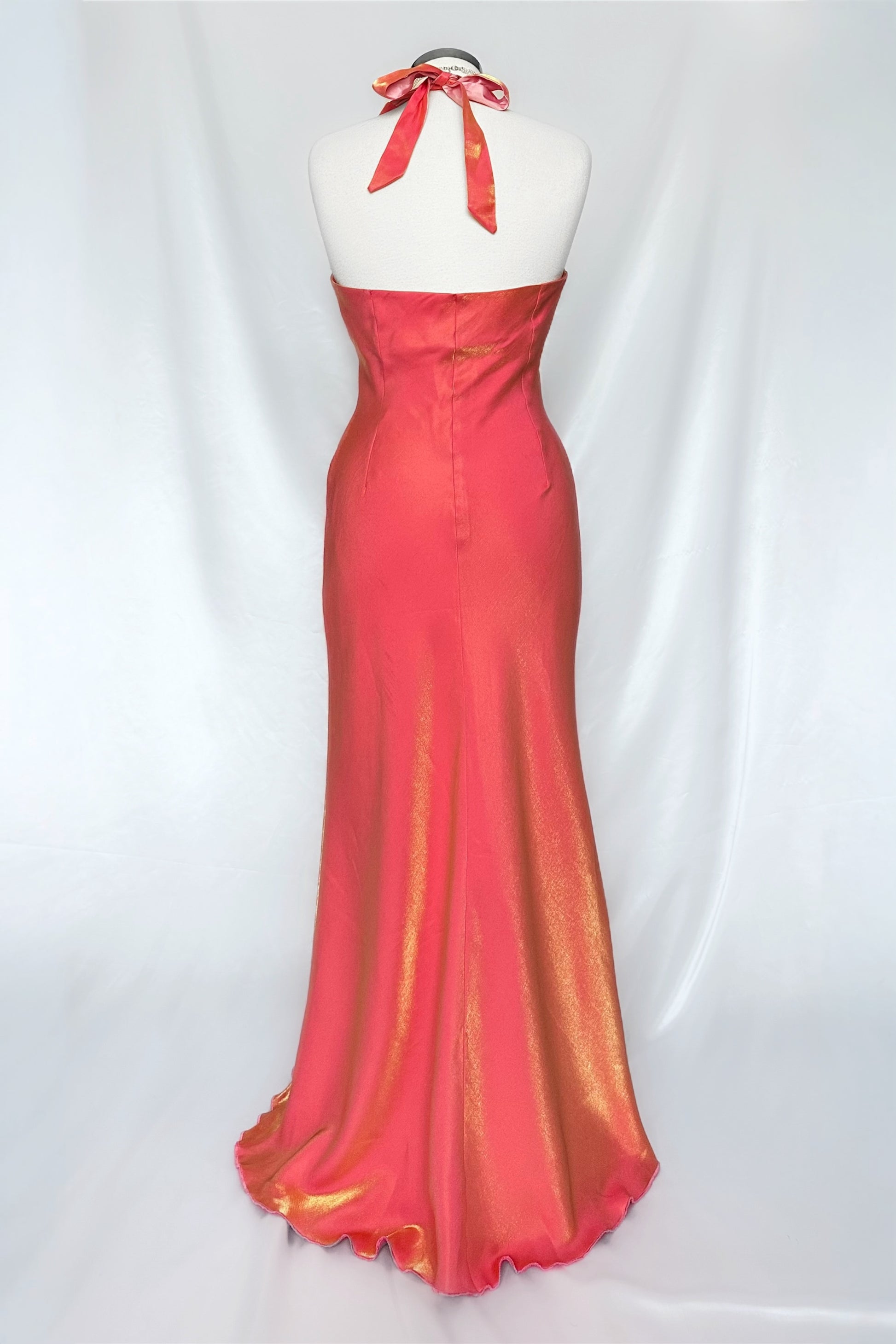 A vision of molten luxury, this halter-neck gown glows in a fiery blend of coral and gold. Cut on the bias for a flawless drape, it skims the body with liquid-like movement and a soft, sweeping hem. Finished with a thigh-high slit, it’s your golden hour glow, captured in iridescent fabric.