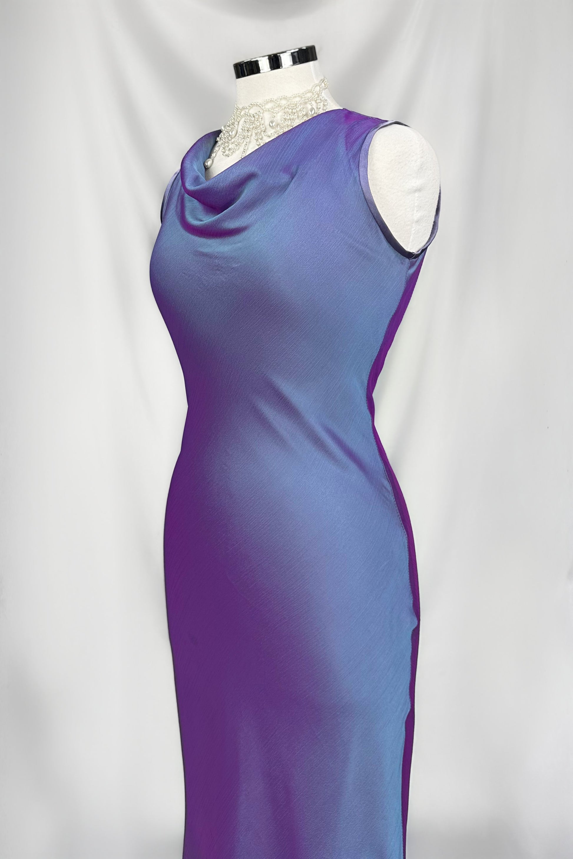A mesmerising slip of colour, this gown drapes the body in a dreamy iridescent gradient of sapphire blue melting into amethyst purple. The soft cowl neckline and fluid bias cut create an effortlessly elegant silhouette, while the lightweight mesh catches the light with every step. Finished with a delicate keyhole back, this piece is pure sophistication with a touch of ethereal magic.