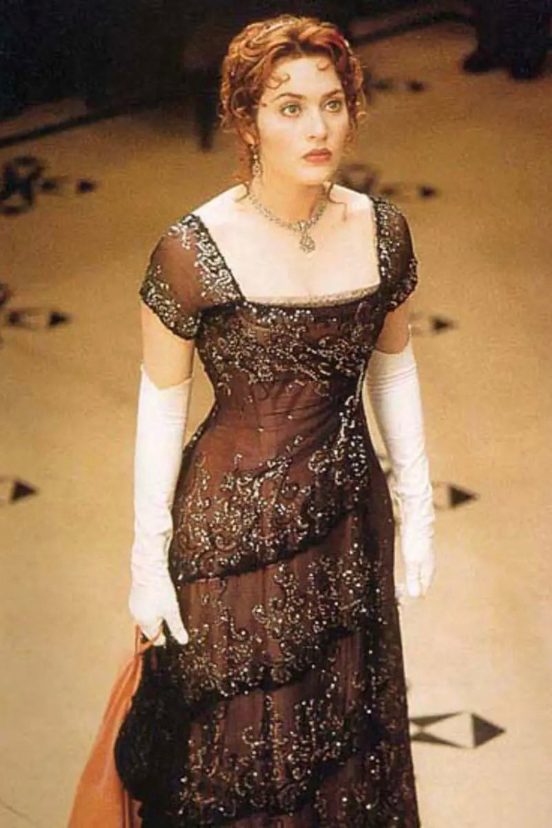A mesmerising tiered gown that shimmers like starlight against the night sky. Crafted in sheer black chiffon and adorned with intricate silver beadwork, this piece cascades in layered elegance, sculpting the body with a soft hourglass silhouette. The subtle sparkle and fluid drape give it an ethereal allure, timeless, graceful, and captivating from every angle, reminiscent of Rose’s unforgettable gown in Titanic.
