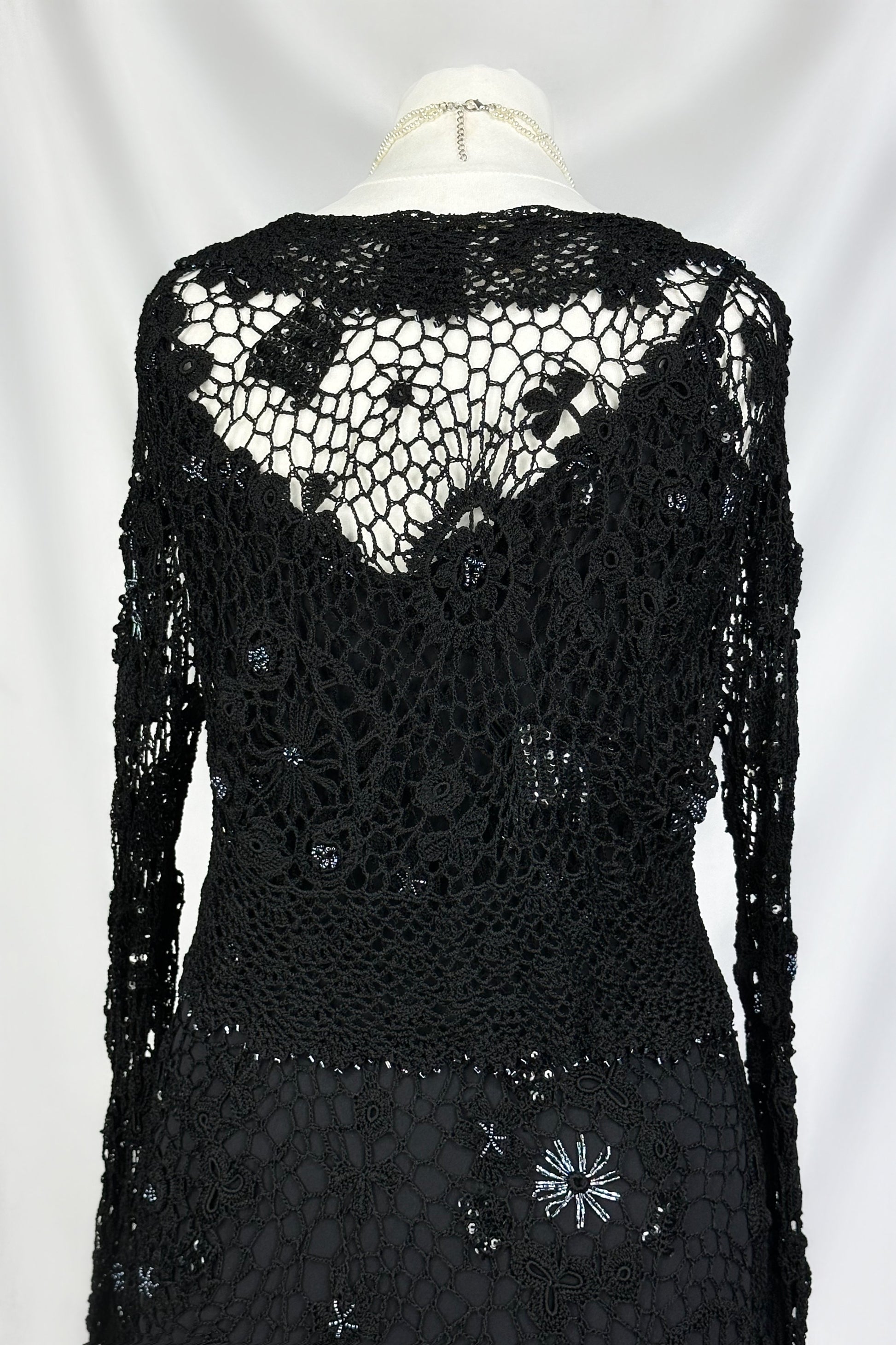 A spellbinding creation in jet-black crochet lace, intricately hand-beaded with shimmering accents that catch the light like midnight stars. The curve-hugging silhouette flows into a dramatic fringed hem, while the matching crochet shrug adds a touch of dark romance. A one-of-a-kind masterpiece made for the woman who commands every room she enters.