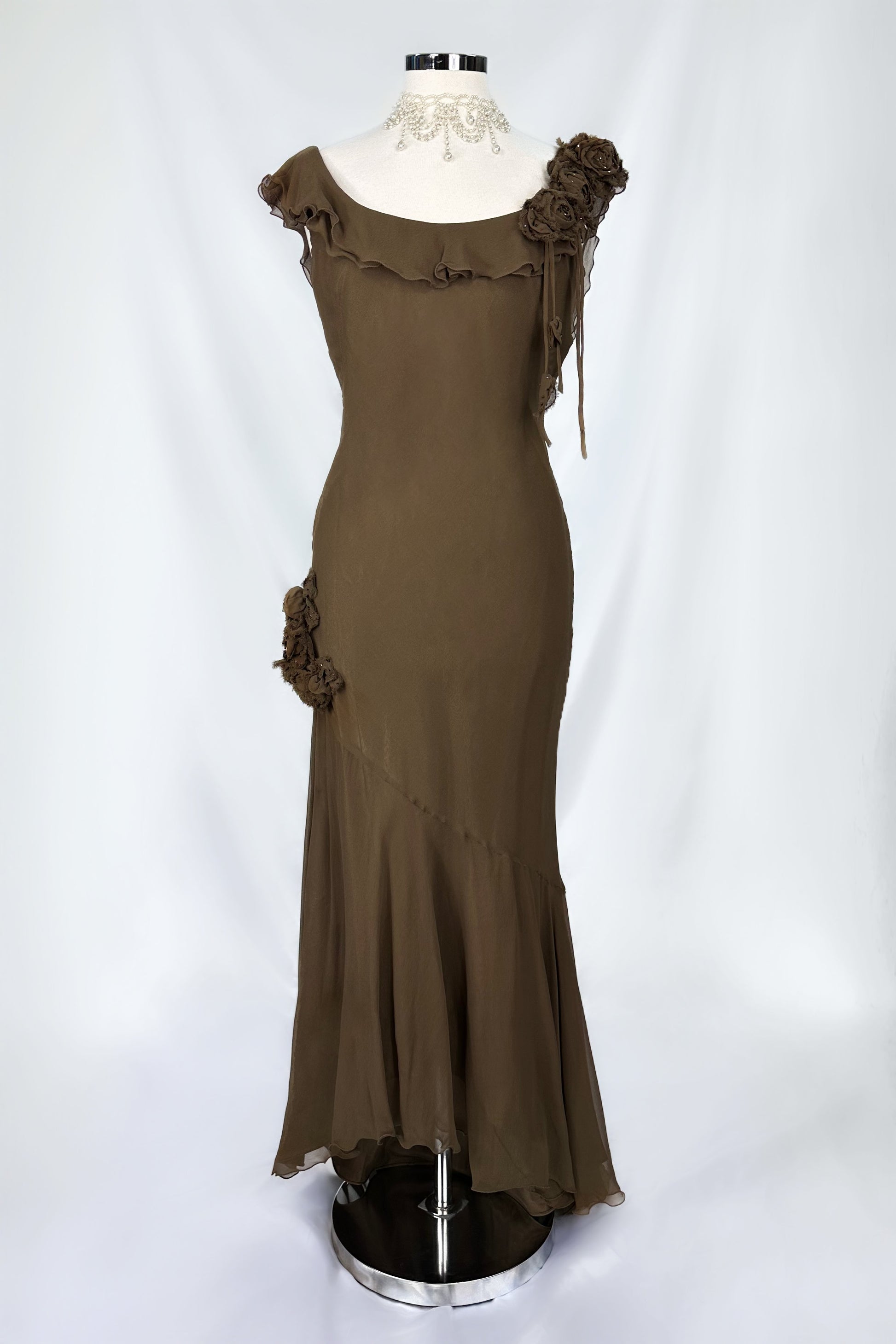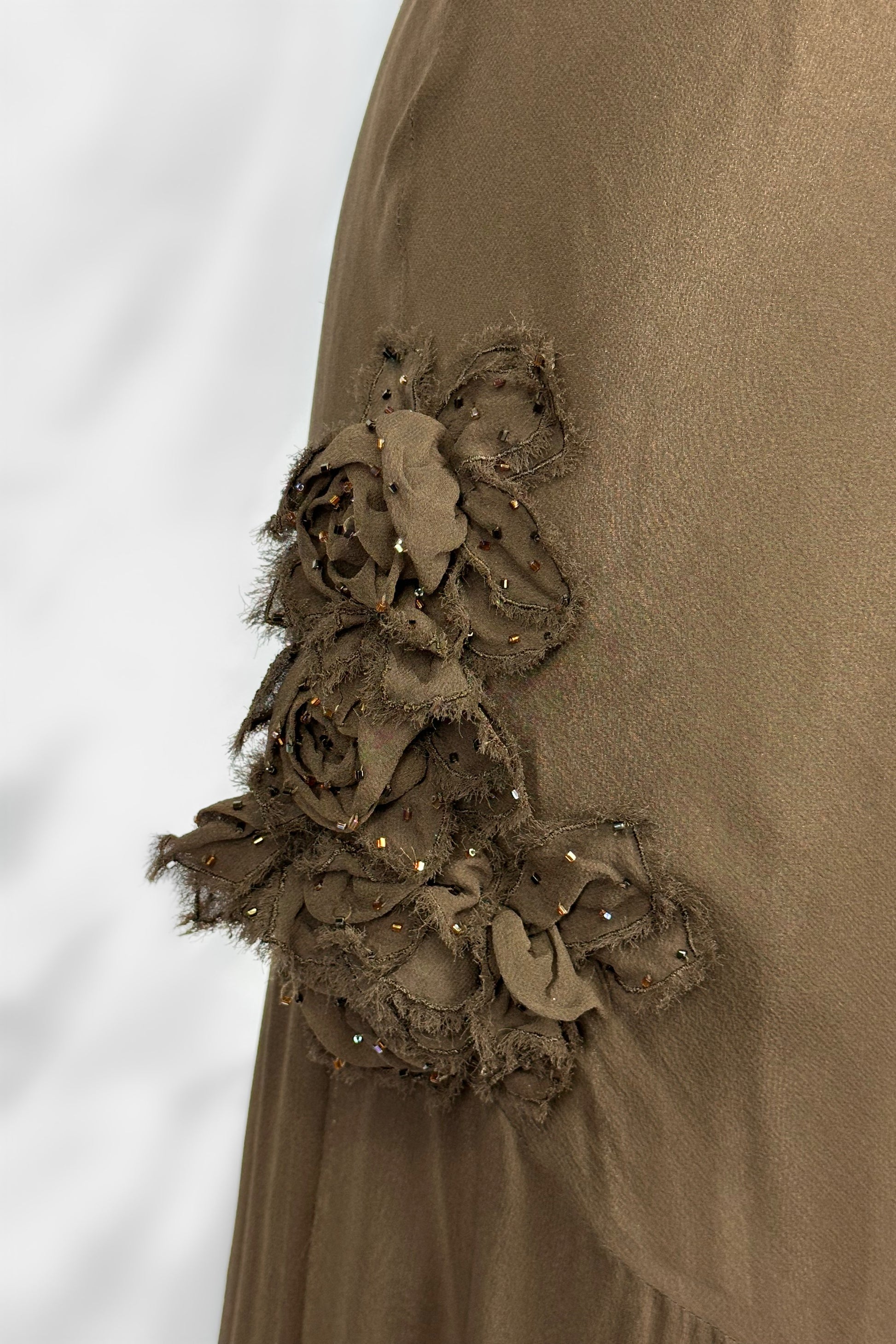 A decadent statement in pure silk, this gown is adorned with delicate hand-crafted rosettes and subtle beaded accents that shimmer with movement. The asymmetric floral detailing along the shoulder and hip adds sculptural romance, while the soft drape and fluid hem create an elegant silhouette. Finished with a deep open back, this piece captures timeless sophistication with a modern edge.