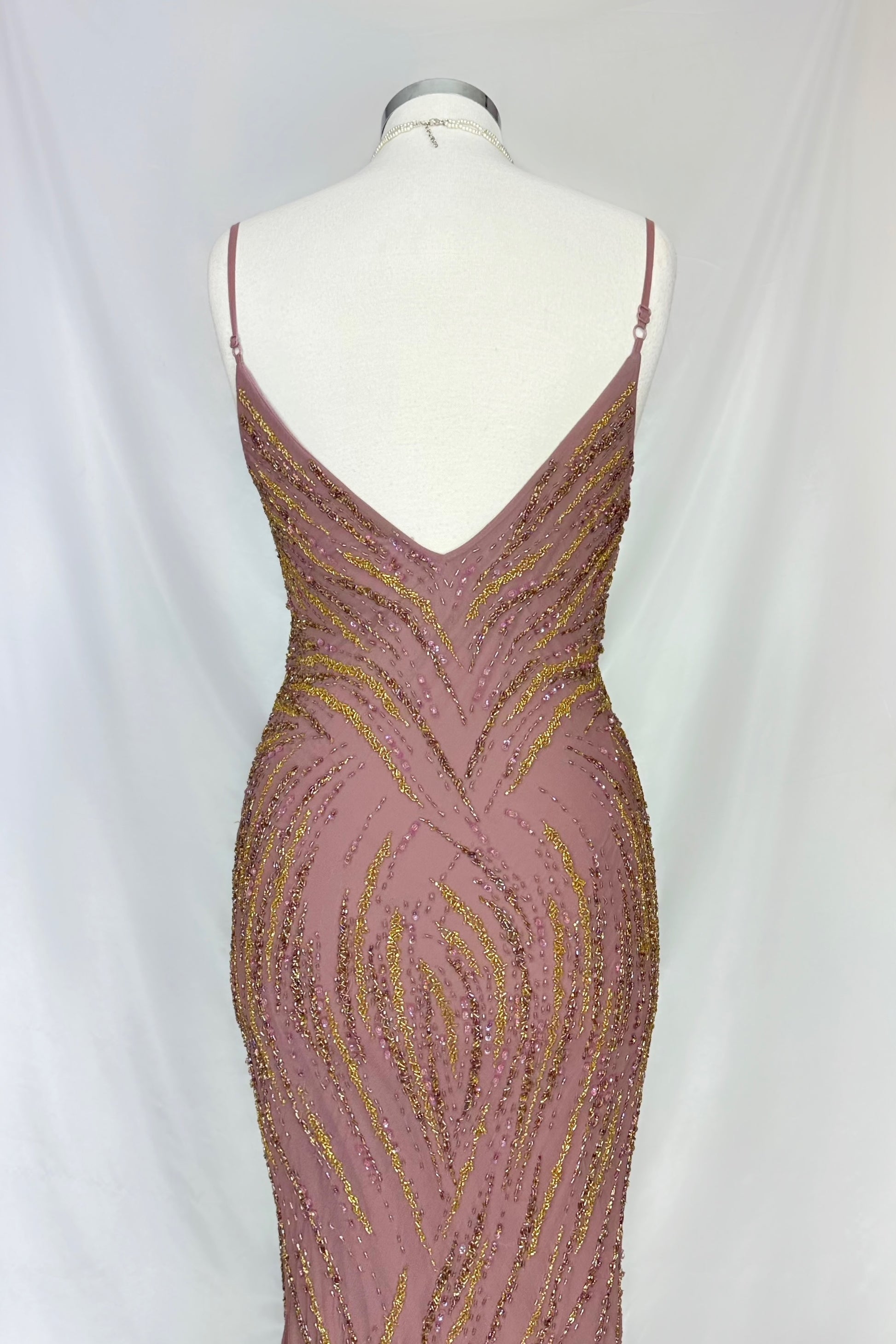 Dripping in elegance, this rosewood-hued gown is a vision of opulence. Adorned with intricate gold and pink beadwork that cascades like golden flames, it hugs the silhouette before flowing into a mesmerising train of sheer, fluttering chiffon. Complete with delicate draped sleeves and a matching scarf, this piece is pure enchantment-perfect for those who want to leave a lasting impression.
