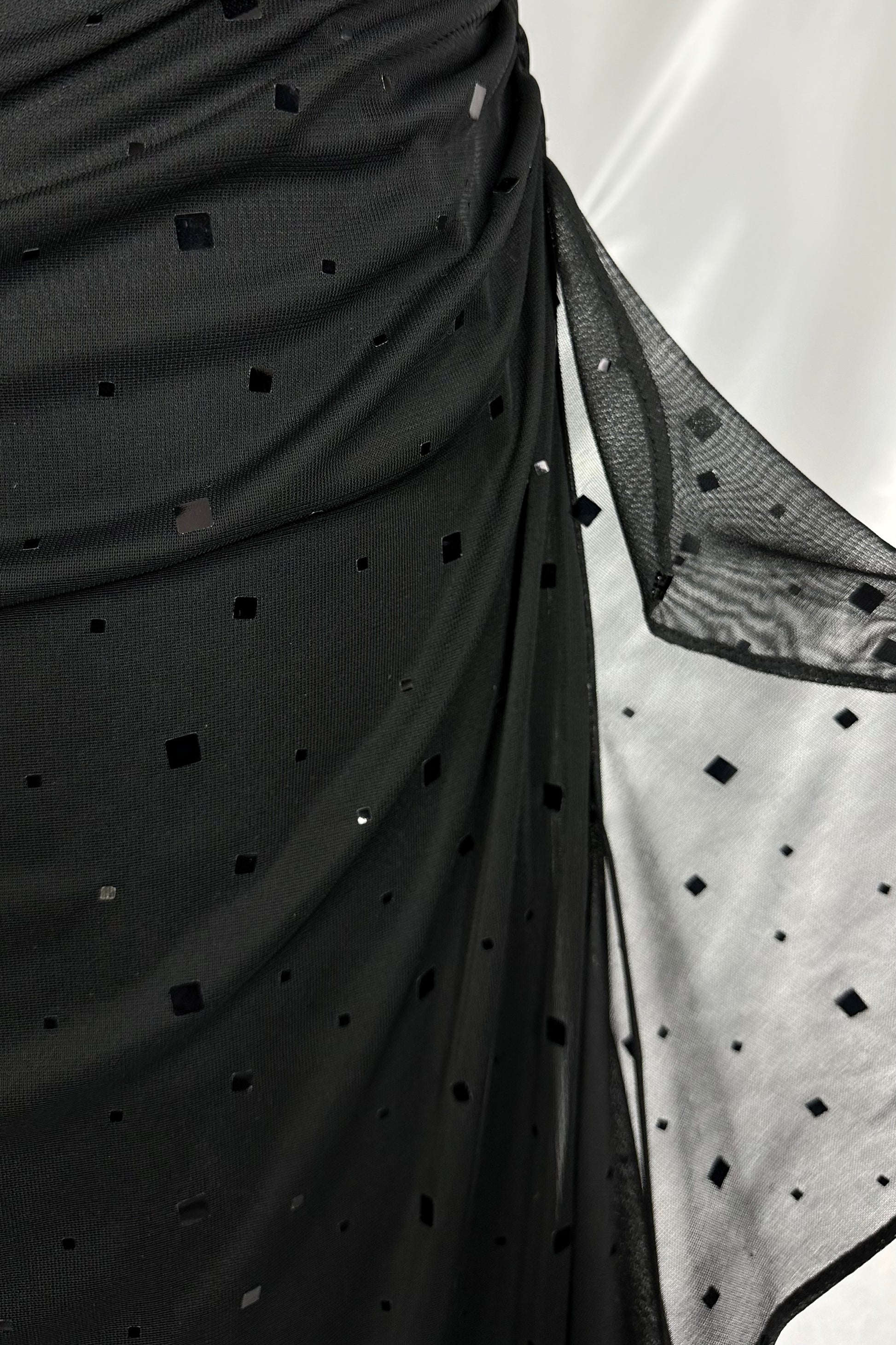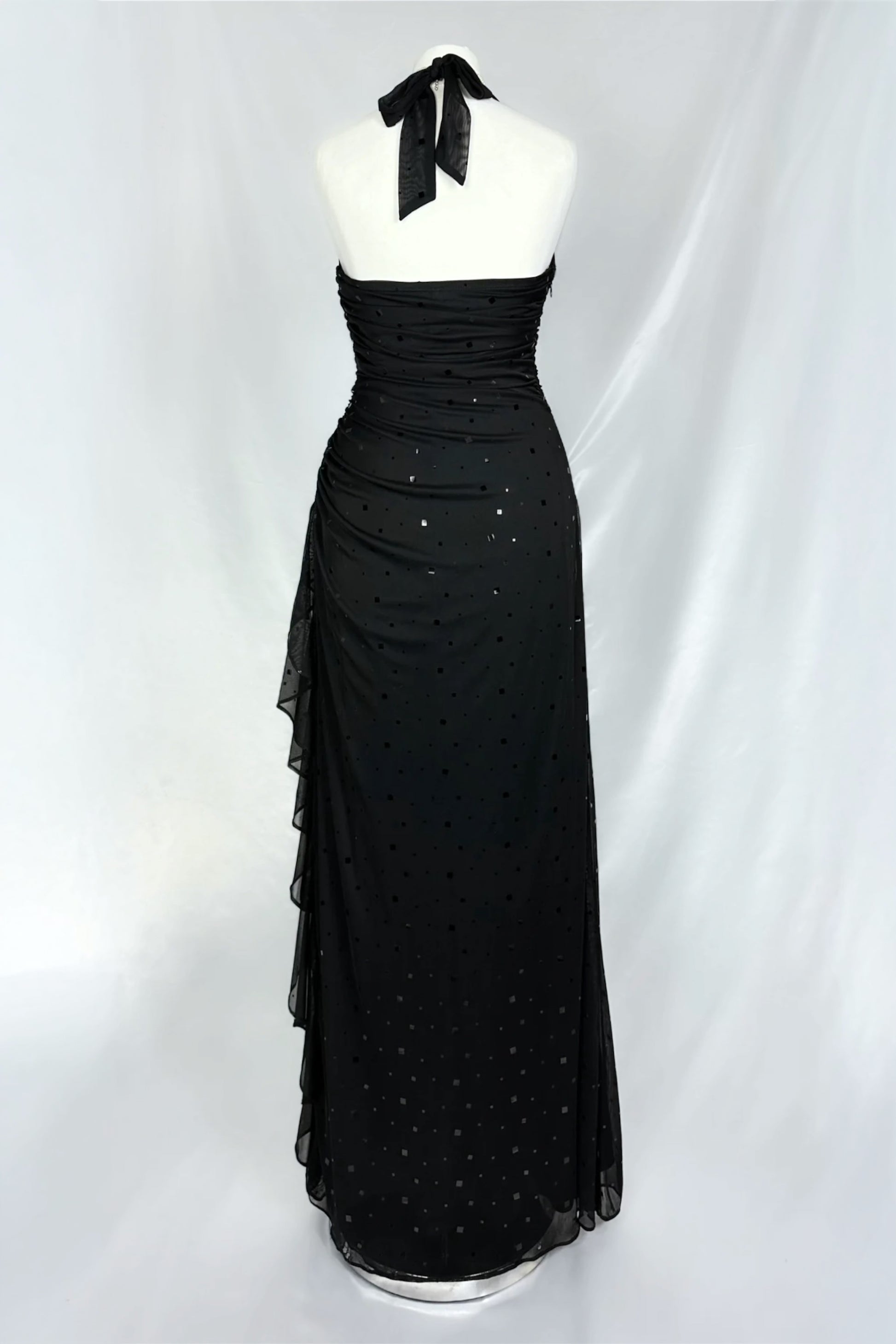 DETAILS: Radiate elegance in this stunning black halter gown, featuring geometric sequin embellishments. With a flowing side ruffle and a flattering silhouette, this dress captures timeless sophistication for your most glamorous occasions.
