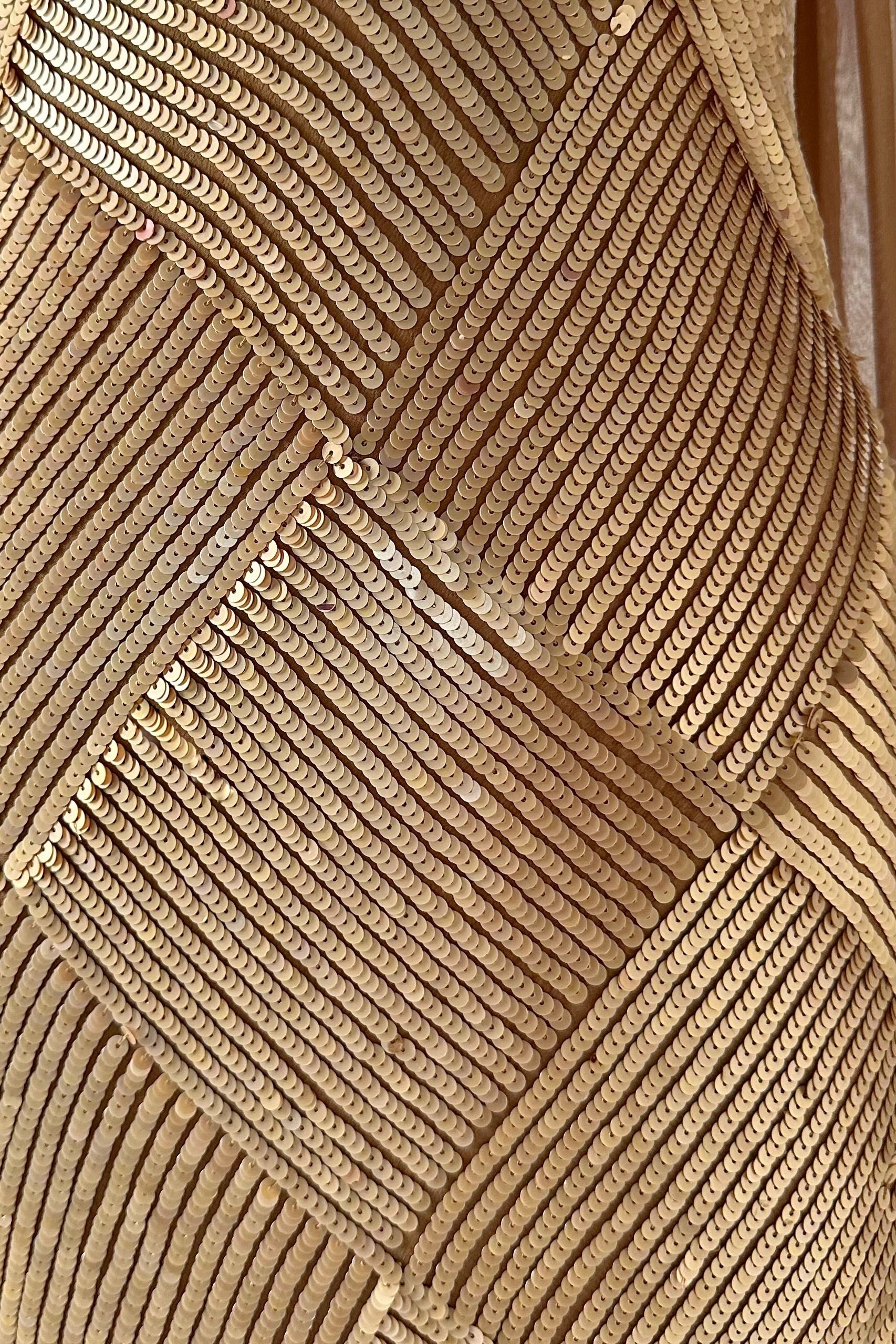 This breathtaking golden gown is the epitome of elegance and sophistication. Featuring an intricate sequin design that shimmers with every step, the dress beautifully contours the body with its art-deco-inspired geometric pattern. Its draped neckline adds a touch of softness, while the long, flowing silhouette exudes timeless glamour. Whether for a high profile event or a special evening, this stunning dress ensures you’ll stand out in radiant style. Side zip closure.