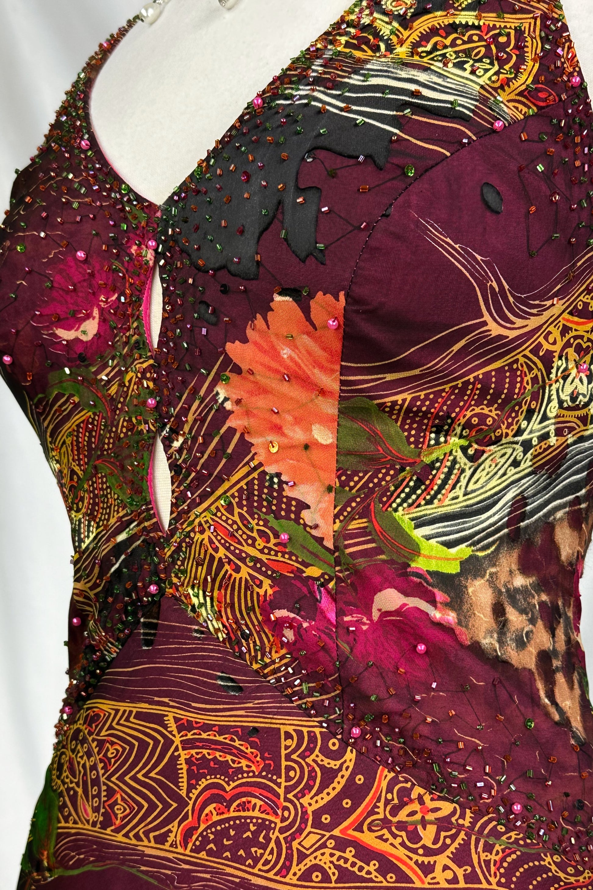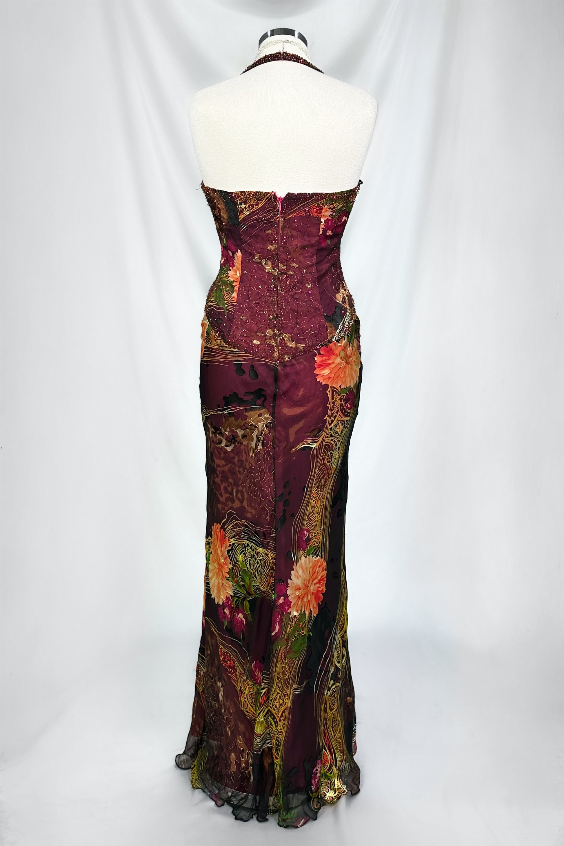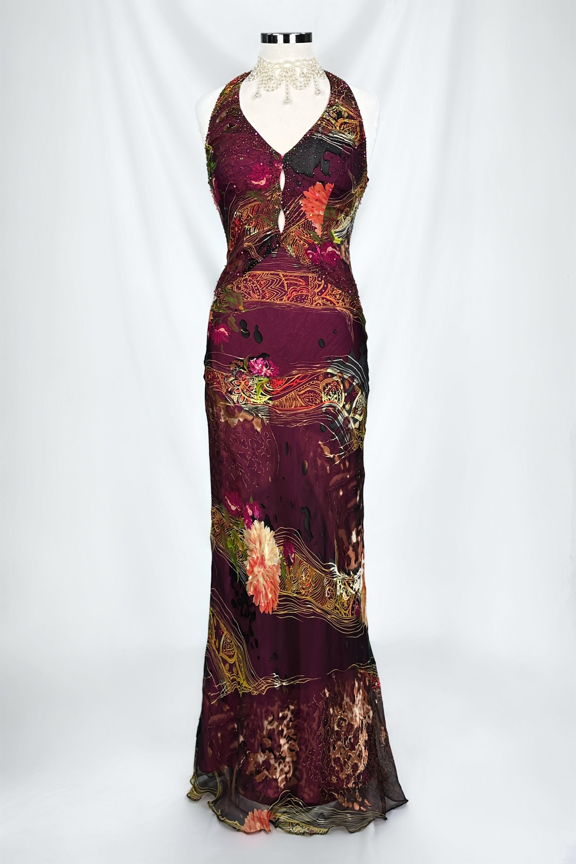 A hypnotic fusion of deep burgundy-plum and burnished gold, this dress drapes the body in pure allure. Its halter neckline frames the décolletage while intricate beading catches every flicker of light, cascading through the abstract floral print like embers in motion. The figure-hugging silhouette flows into a soft, fluid hem—creating a masterpiece that feels both artful and untamed. A statement piece for the woman who commands the room she enters.