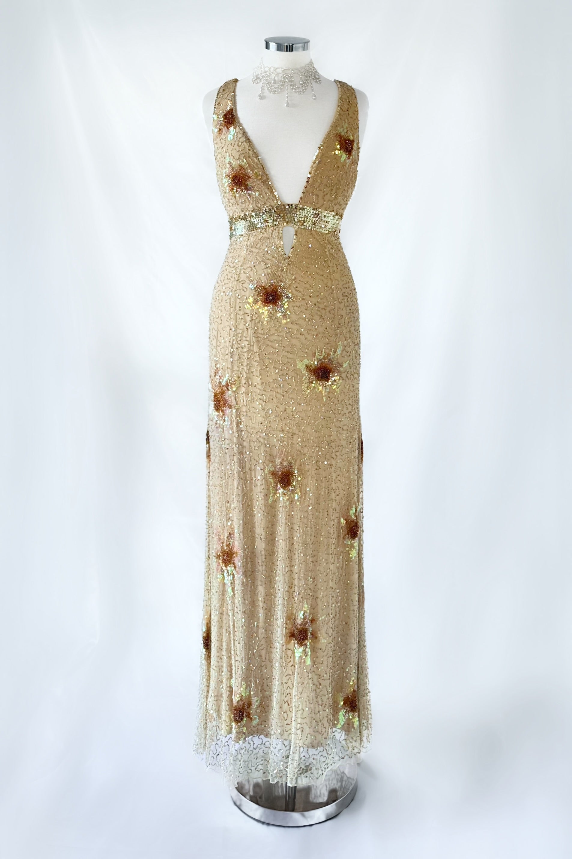 Make a statement in this stunning nude & gold gown, adorned with dazzling sunflower-shaped sequin and beaded embellishments. These intricate sunflowers, crafted in rich gold and bronze tones, are delicately sewn throughout the dress, catching the light to create a magical, iridescent sparkle with every movement. The shimmering sequins and beads give the dress a mesmerizing, otherworldly glow, ensuring you shine from every angle.