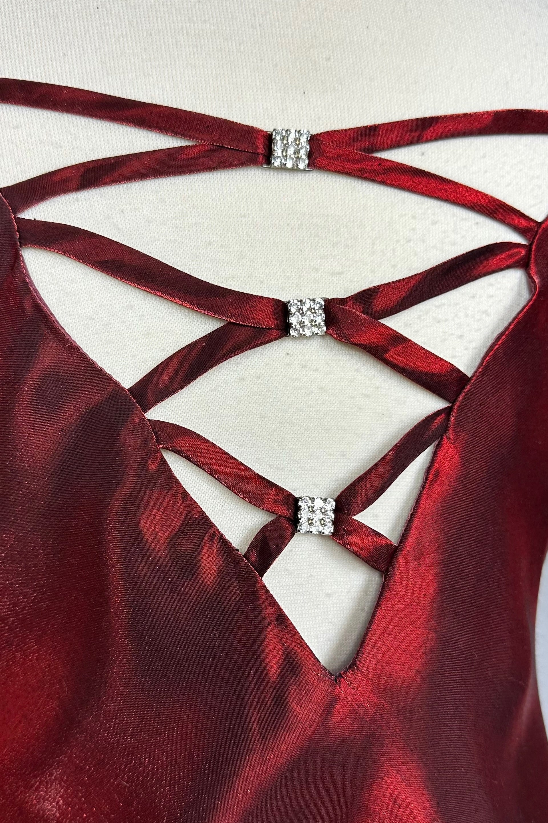 Turn heads in this striking red slip dress, featuring a liquid iridescent sheen that drapes elegantly over your silhouette. The crisscross diamanté detailed back adds an alluring detail, perfect for making a statement at any formal or festive occasion.