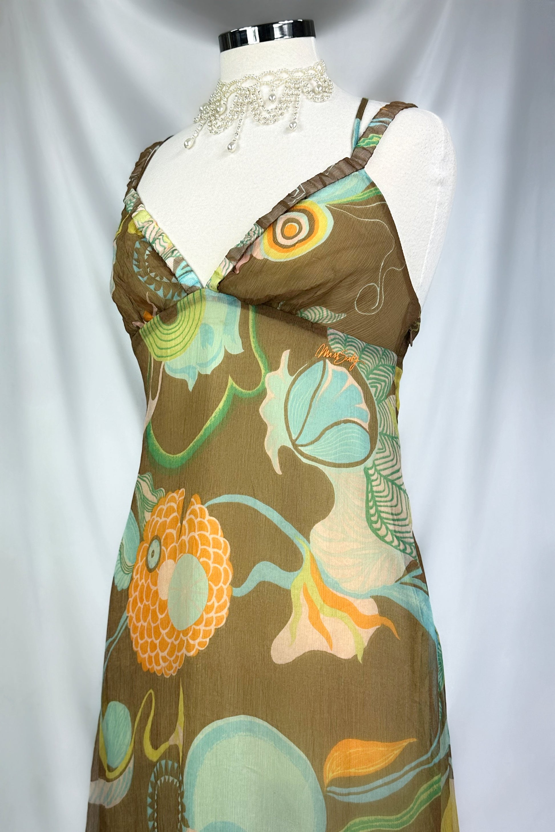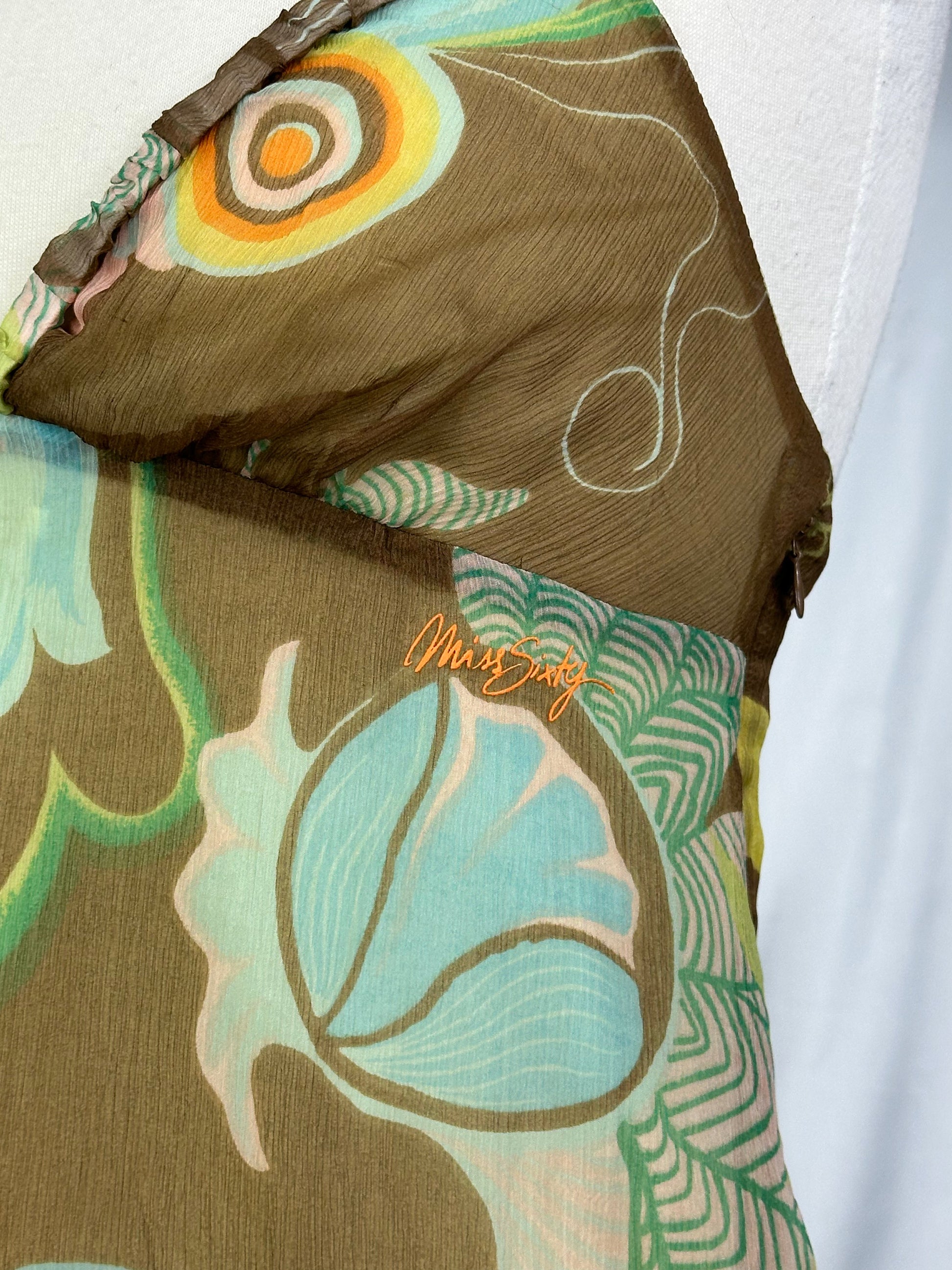 A fusion of retro and aquatic charm — this Miss Sixty mesh slip dress features an earthy brown base awash with ocean-inspired florals in turquoise, citrus, and sea foam tones. The cross-back straps and figure-skimming silhouette create an effortlessly sensual shape, while the lightweight silk fabric moves like water. A rare Y2K treasure that feels both free-spirited and artfully composed.