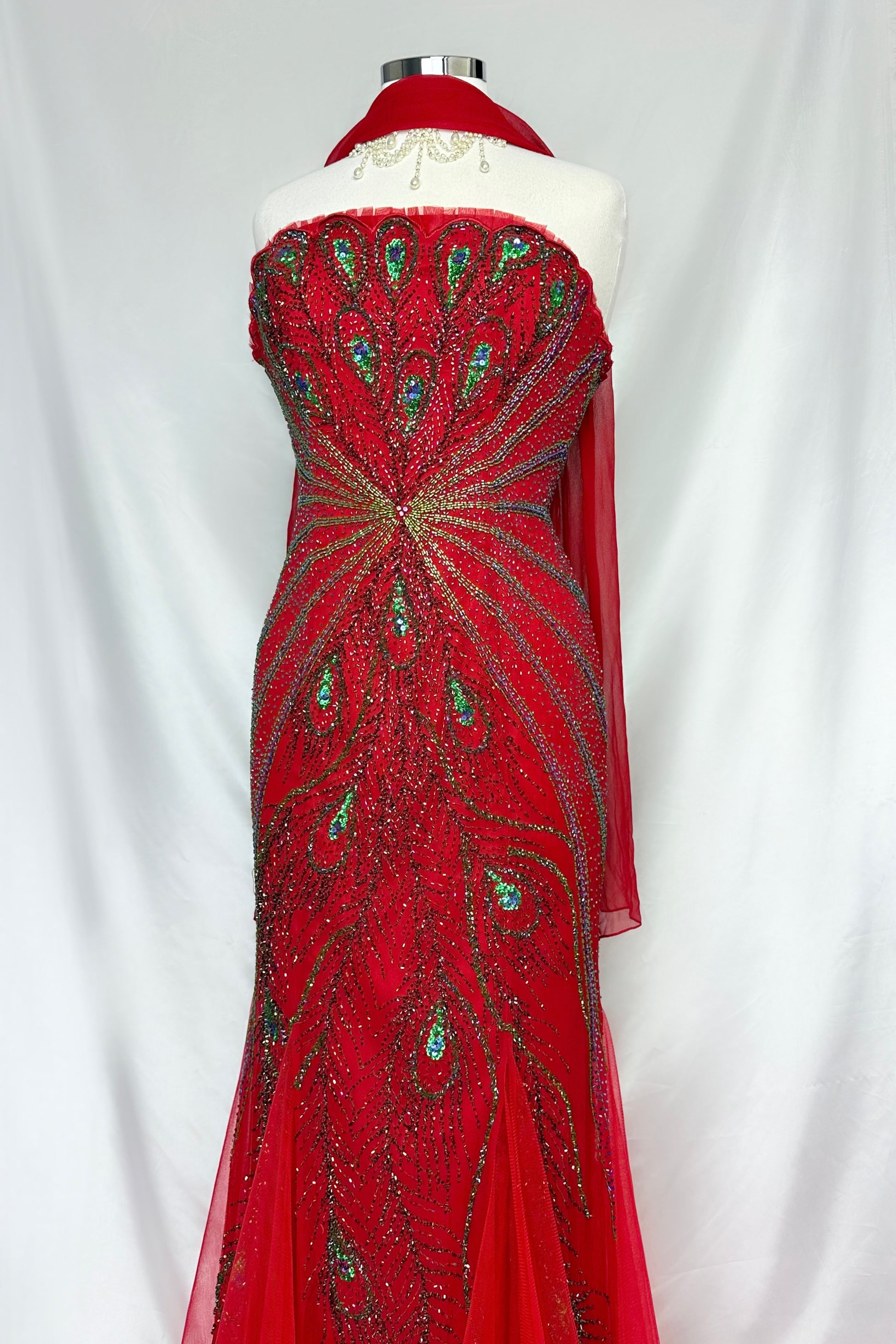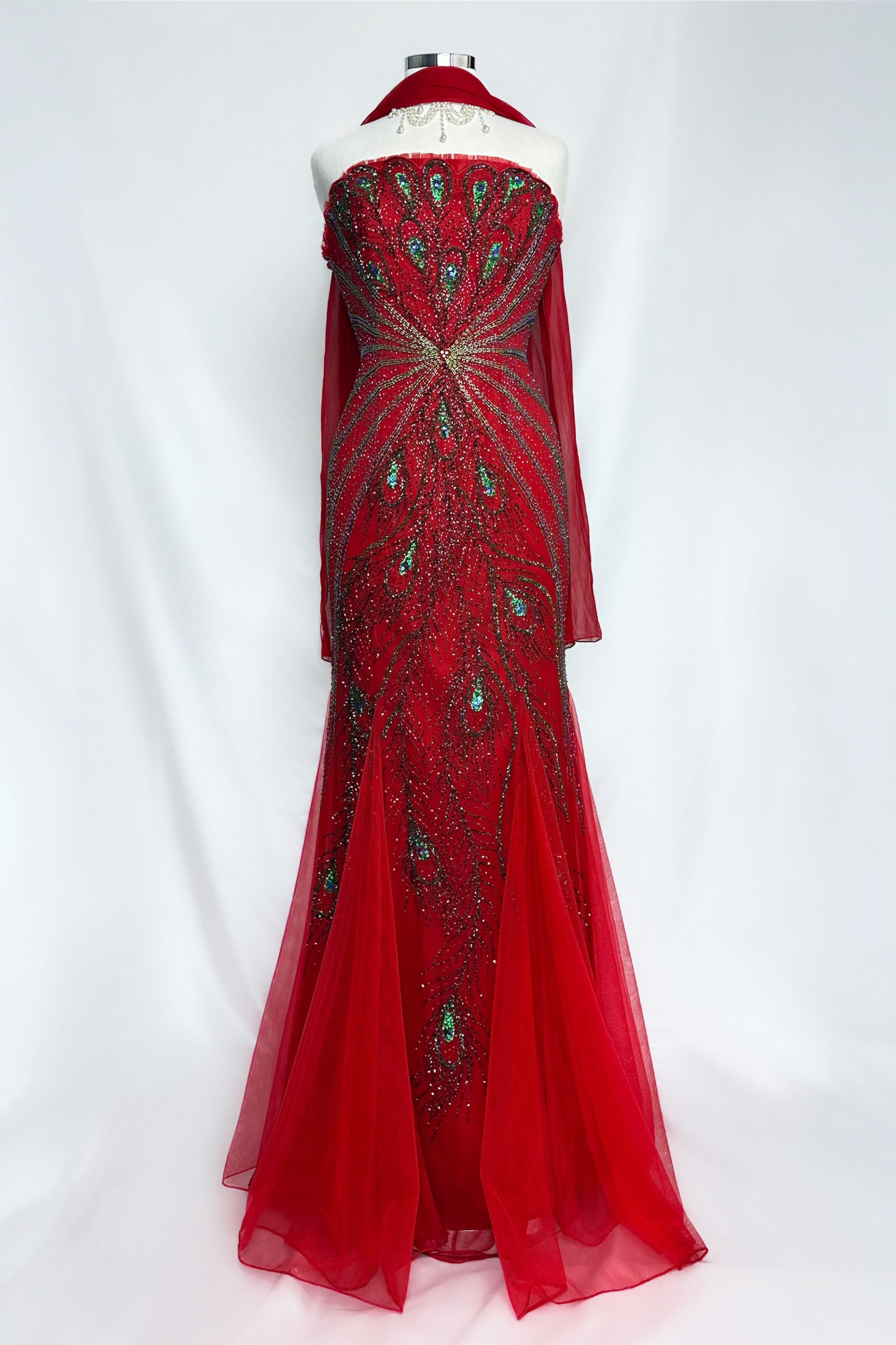 Dazzle in this breathtaking scarlet gown adorned with intricate hand-beaded peacock-inspired designs, shimmering with iridescent green and gold accents. The fitted silhouette flows into a cascading train of sheer elegance, perfect for turning heads at galas, weddings, or formal soirées. This masterpiece combines timeless artistry with bold sophistication, making it a standout addition to your evening wardrobe.