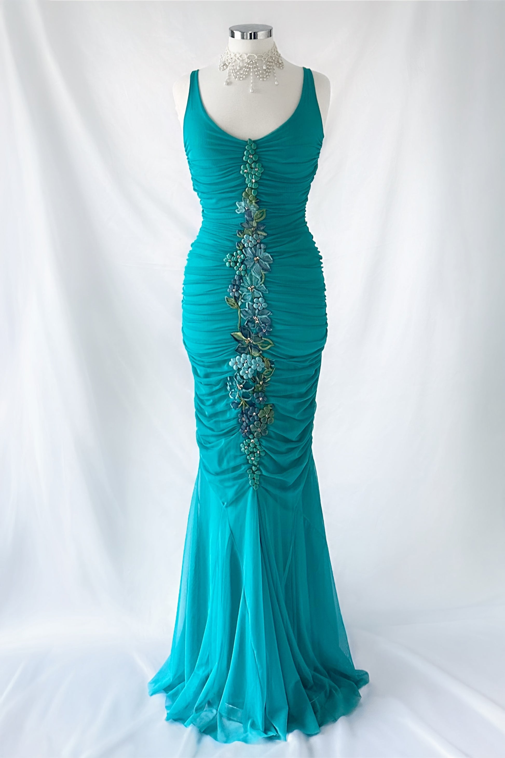 This beautiful rare 90s couture collection Ema Savahl dress features a soft V neck neckline. Turquoise ocean blue colour. Very stretchy. Crafted with blue floral vine hand painted flowers & crystallised with high quality Swarovski in the flowers centres. Worn by many celebs like Paris Hilton & Katy Perry. Raw hem. Golden bronze Swarovski Crystals.