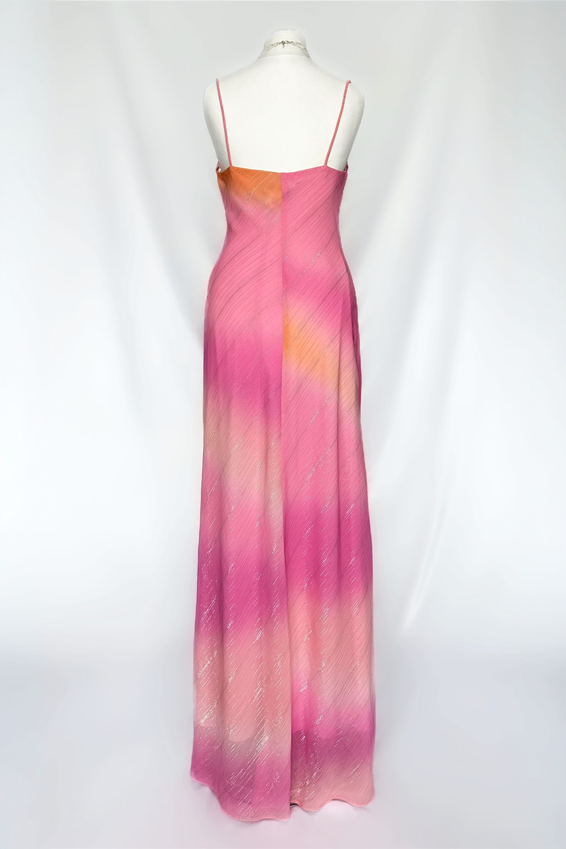 Step into elegance with this breathtaking dress, a stunning fusion of soft pink and warm orange hues that gracefully cascade together. The draped bodice beautifully frames the neckline, while the flowing silhouette skims the figure, offering a flattering fit for any occasion. Crafted from delicate, shimmering metallic threaded fabric, this piece captures light with every movement, making it a perfect choice for evening events or formal gatherings. Elevate your wardrobe with this enchanting piece.