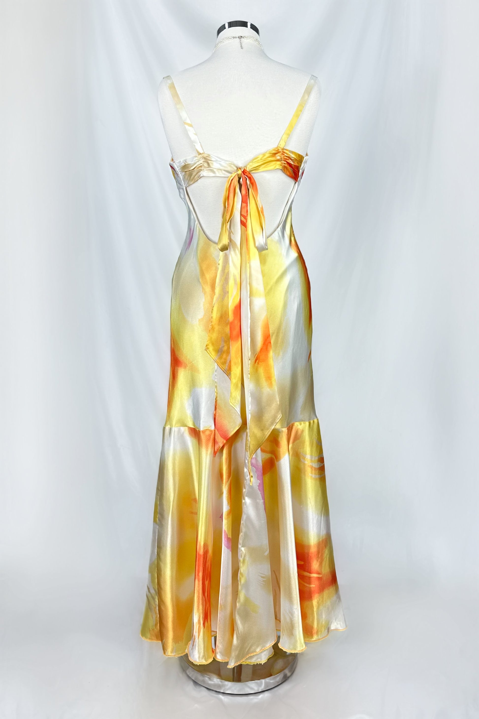 Float into any event in this mesmerising sunset maxi dress. The vibrant orange and sunny yellow abstract print captures the essence of a sunset, while the sweetheart bust and alluring open back with a flowing tie-bow ensure you make a stunning entrance.