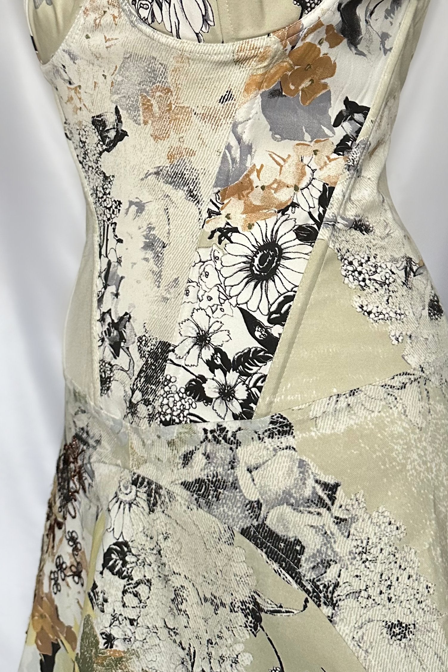 A rare Roberto Cavalli creation that intertwines artistry with sensual structure. Crafted from a denim like floral abstract fabric, this corset dress sculpts the silhouette with precision seams and soft boning through the bodice. Muted gold and sepia tones unfold across a painterly collage of blooms, enhanced by hand-beaded floral motifs that glimmer subtly in the light. Both romantic and daring, this piece captures the essence of Cavalli’s early 2000s glamour