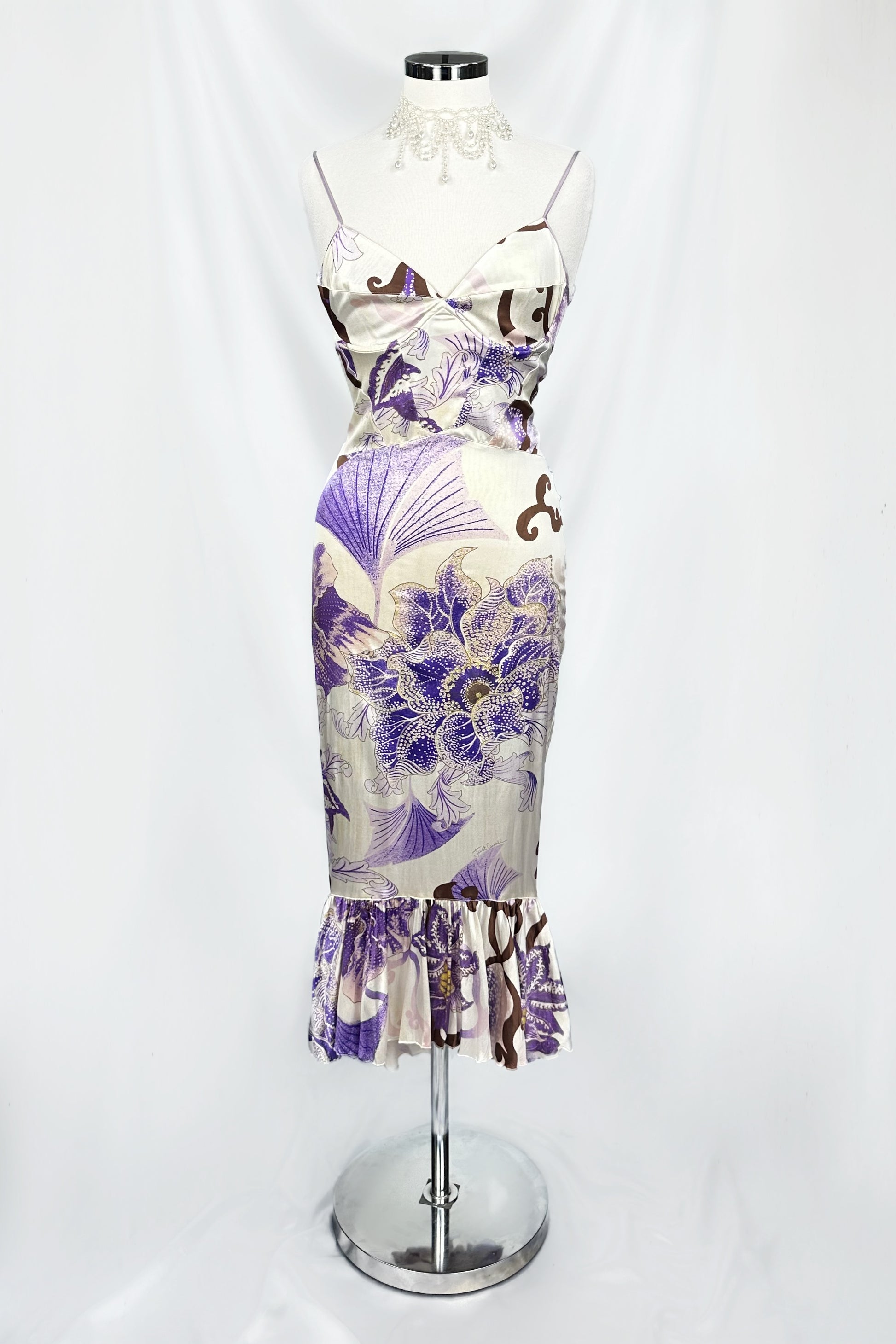 As seen on Kim Kardashian & Kali Uchis. A rare silk 2000s treasure from Roberto Cavalli, featuring a striking botanical and fan motif in shades of violet, cream, and cocoa brown. The figure hugging silhouette is balanced with delicate spaghetti straps, a structured bust, and a flounced hem for a touch of movement. Elegant yet daring, this piece embodies Cavalli’s signature blend of artistry and sensuality