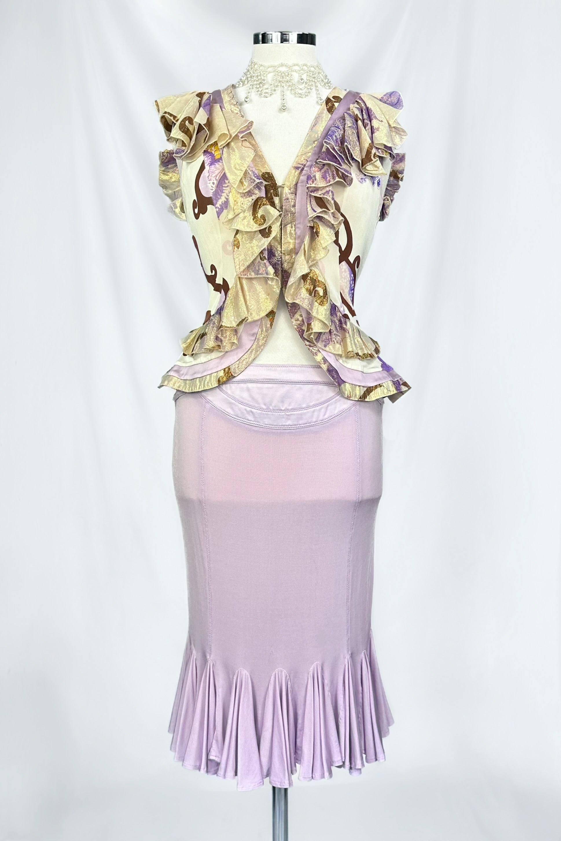 Step into a world of glamour with this gorgeous 00s Roberto Cavalli two‑piece. A ruffle deep‑V peplum vest, adorned in frothy lavender ruffles with shimmering gold accents, artfully cinches at the waist with a satin tie for a flattering silhouette. Paired with a sleek, form‑fitting lavender skirt that flares into delicate folds at the hem. It’s unapologetically bold. The cascading ruffles, satin trims, and ornate floral print demand attention and whisper luxury.