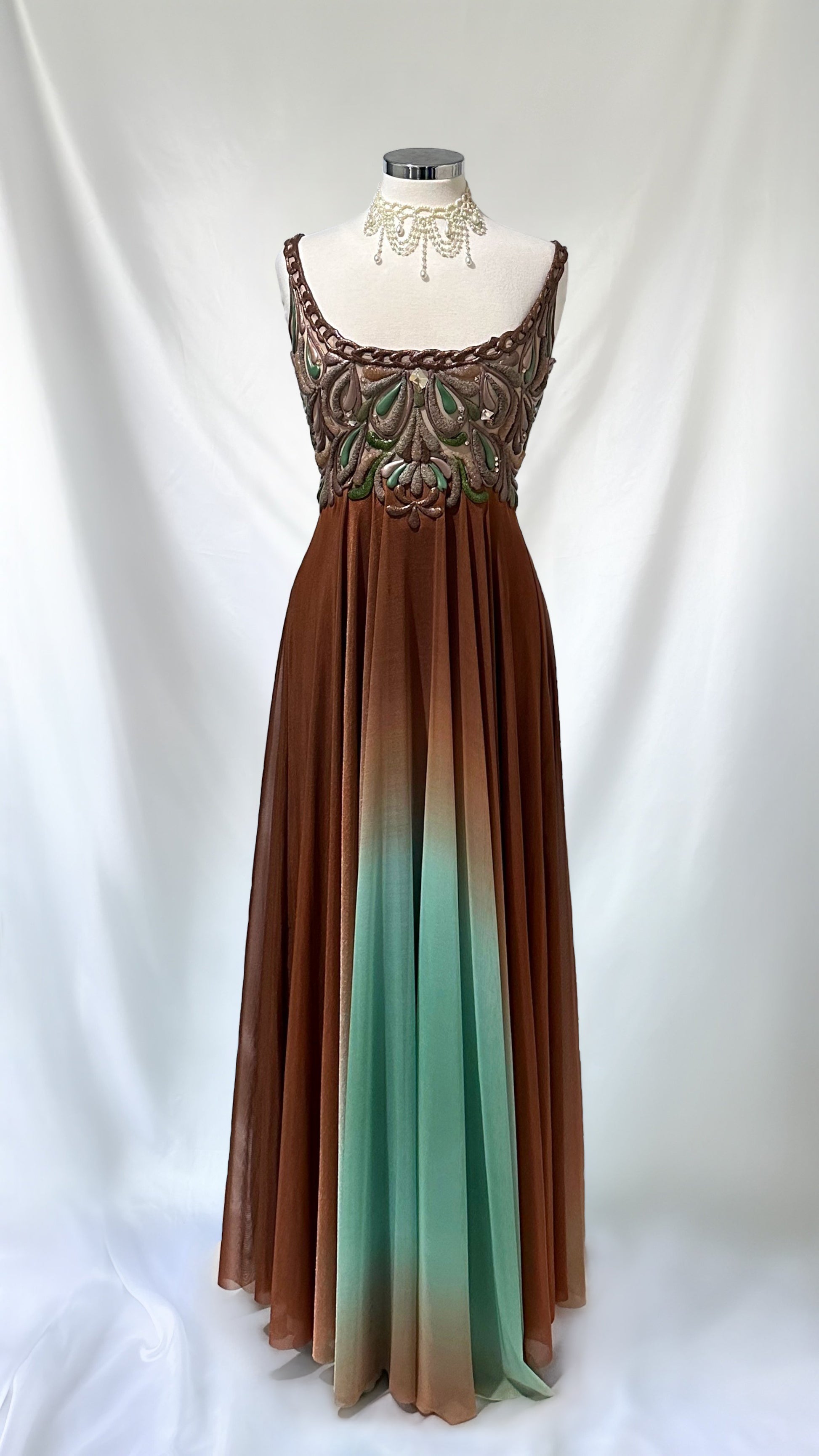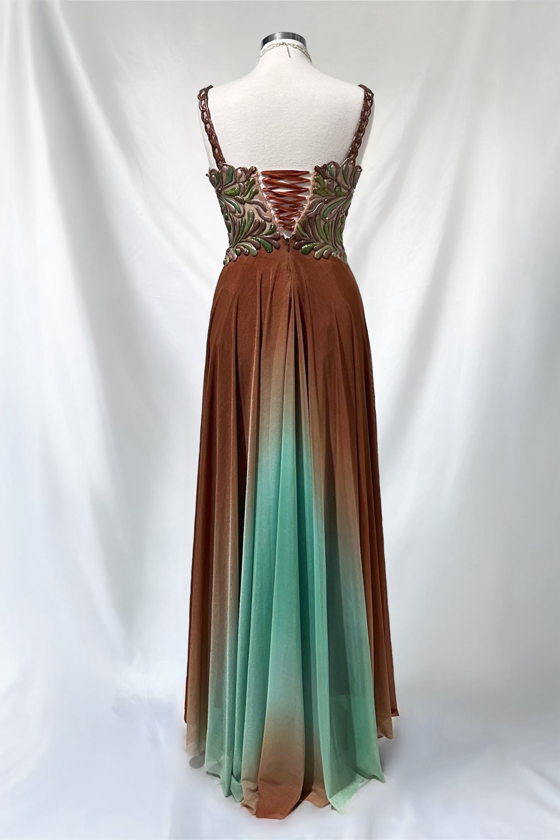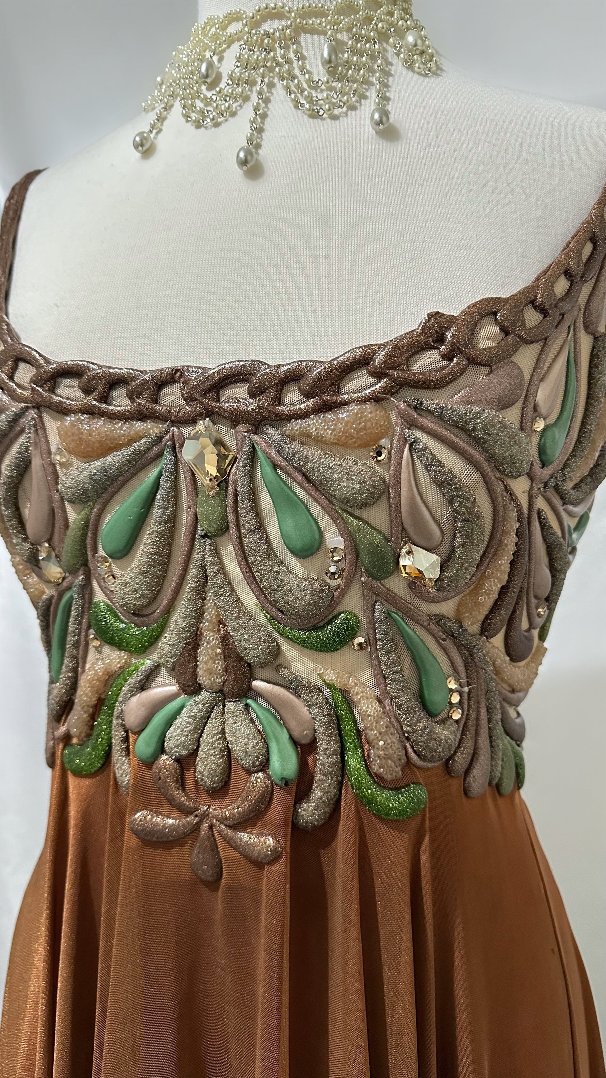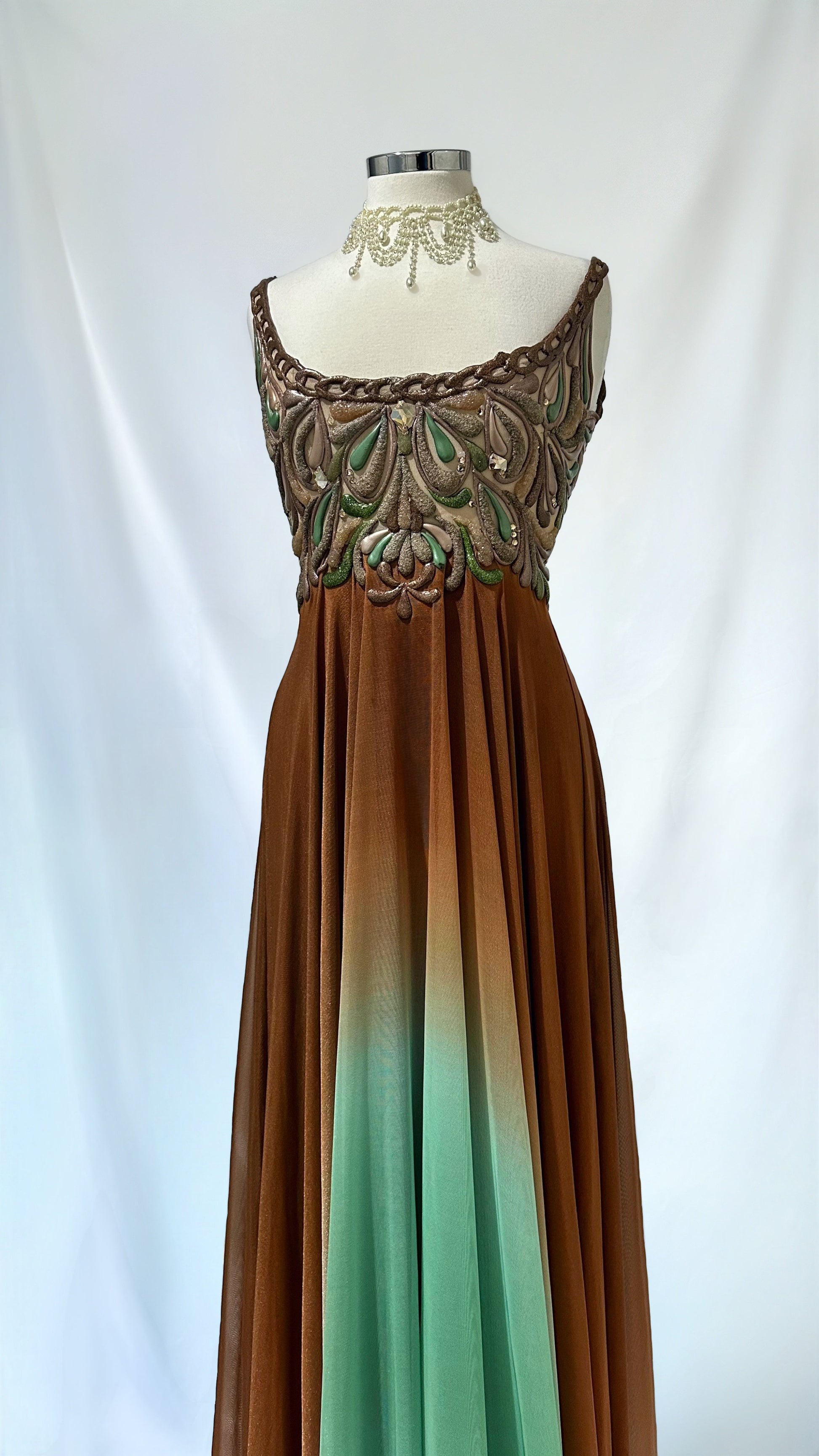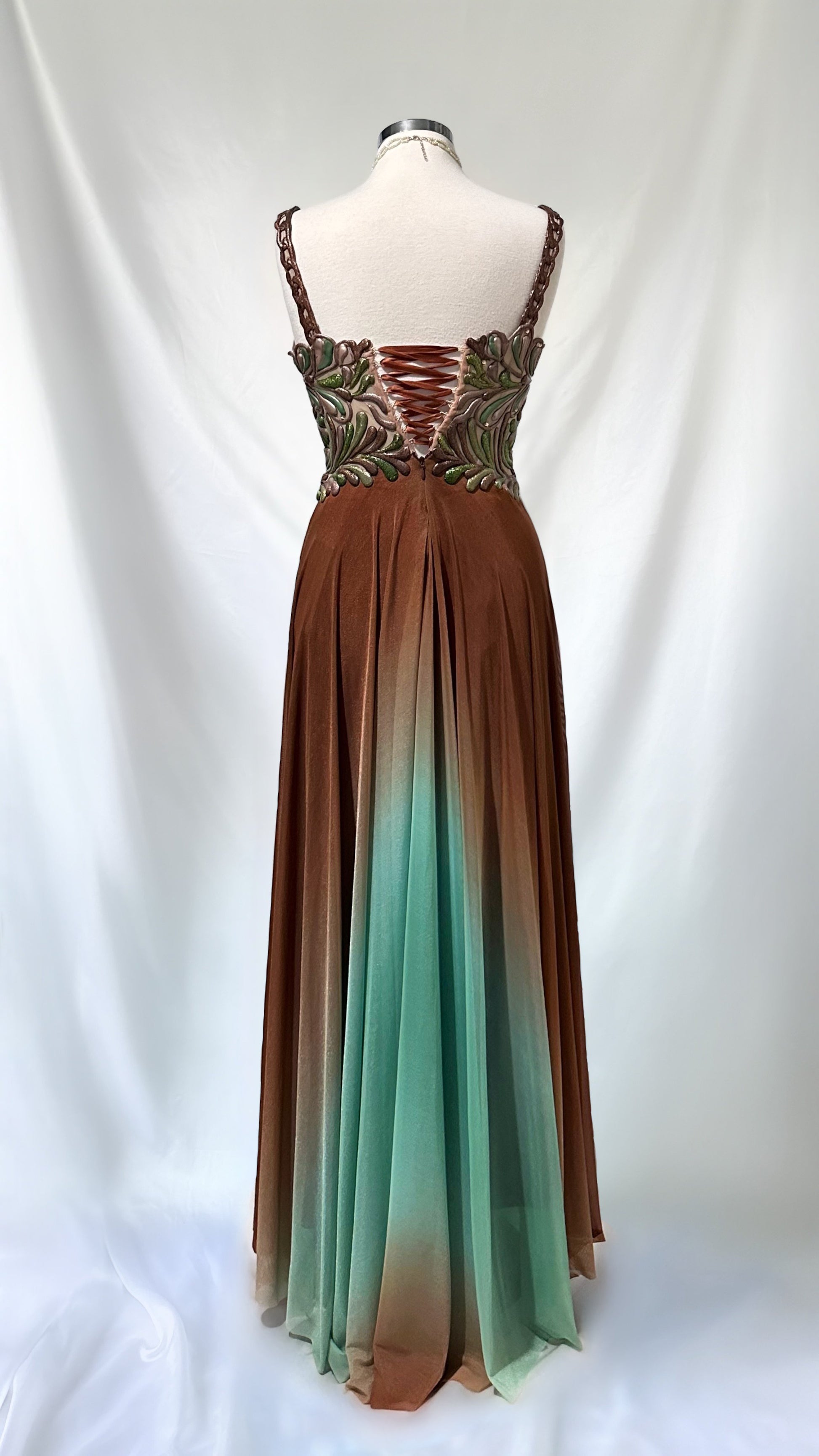 Enter a realm of wintery elegance with this Ema Savahl Couture gown, adorned with sparkling Swarovski crystals on the bust that glisten like icy stardust. The intricate, hand-painted details on the bodice bring a touch of elven magic, as soft hues of earthy brown and a frosty pastel turquoise cascade into a flowing skirt. This gown, with its ethereal quality, captures the essence of an enchanted winter elf forest, perfect for those seeking a truly captivating, otherworldly style.