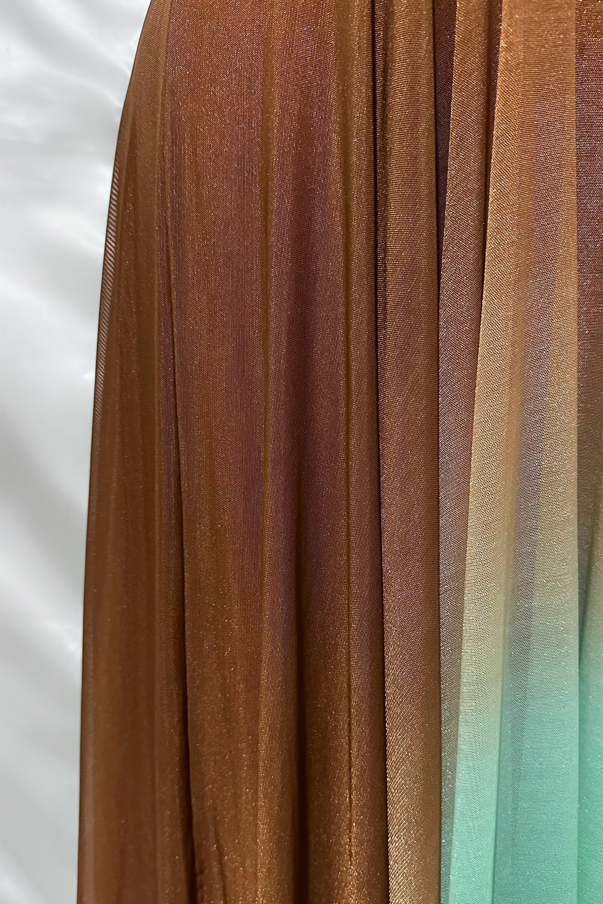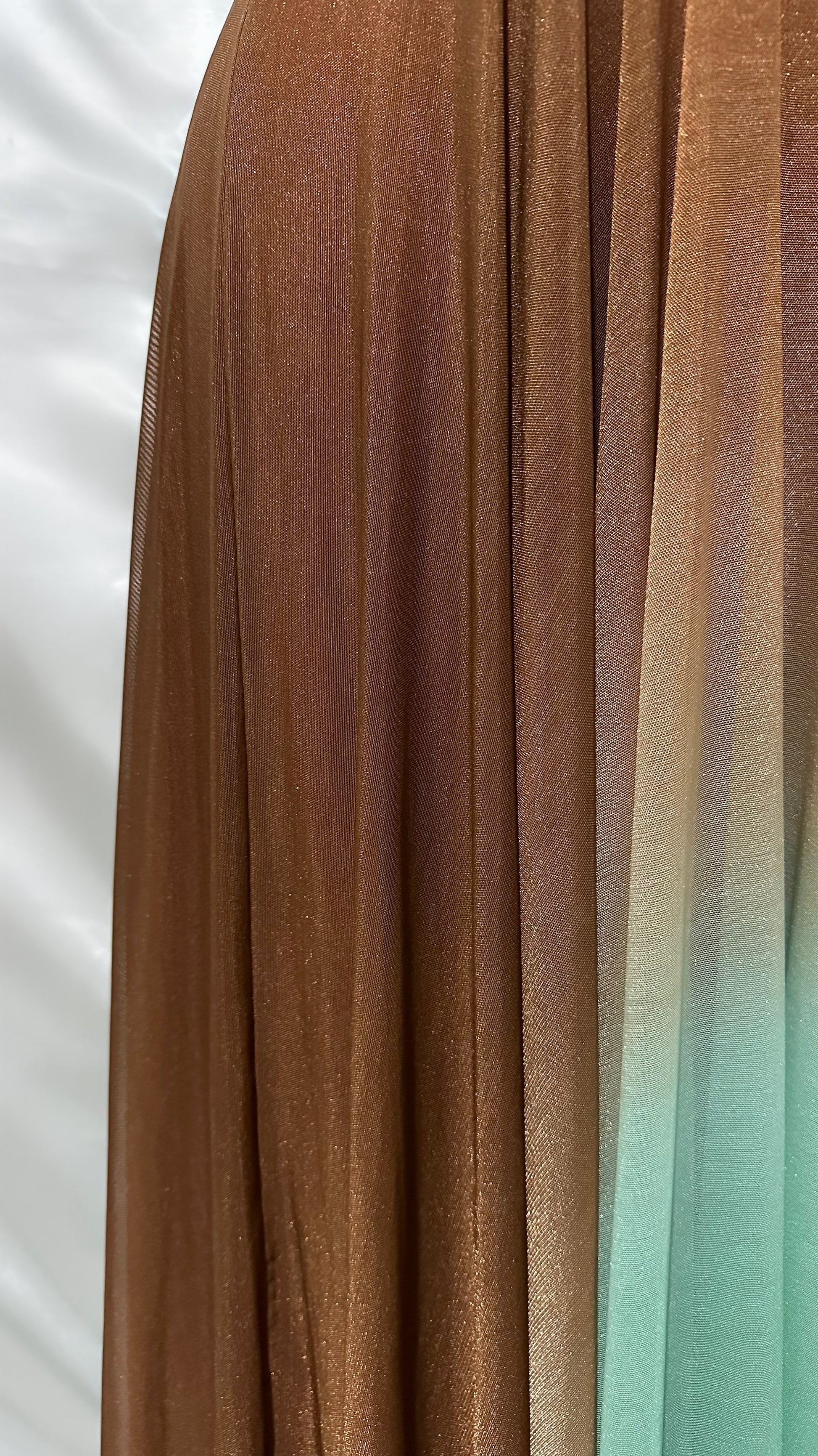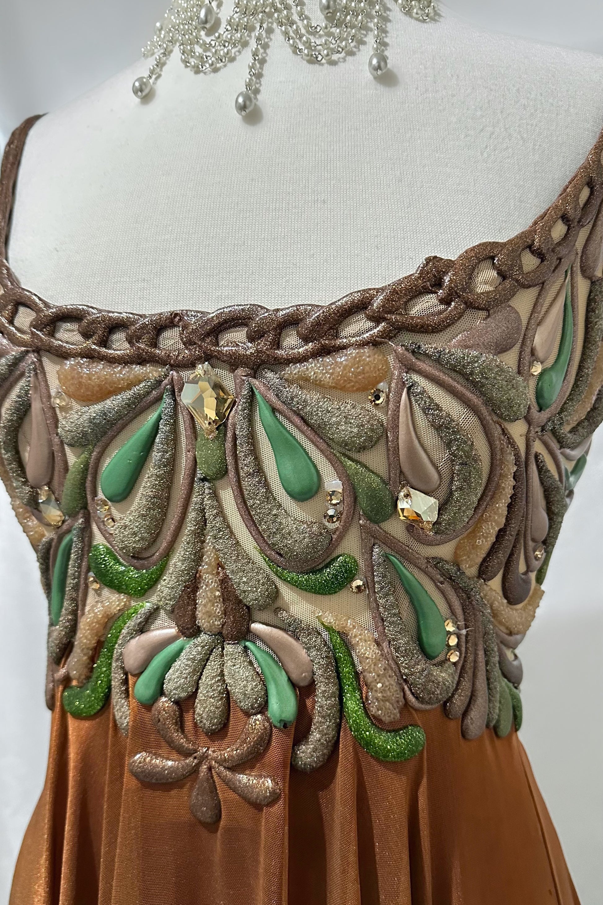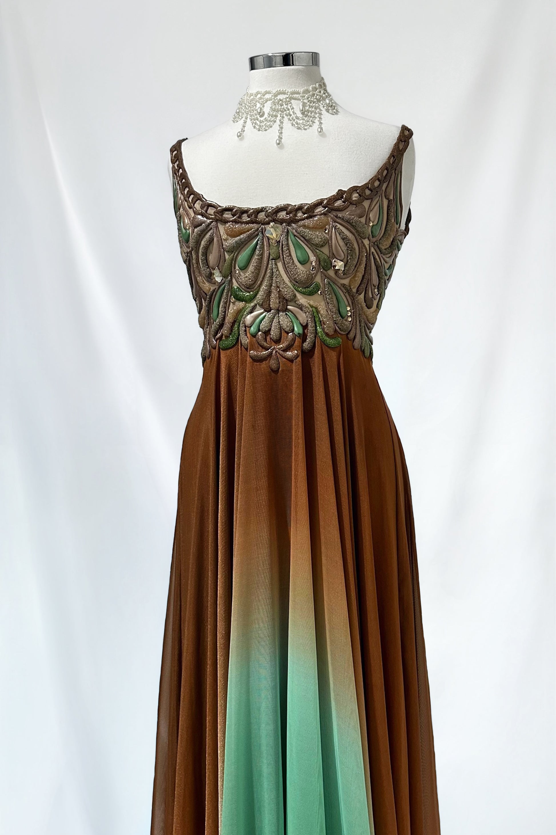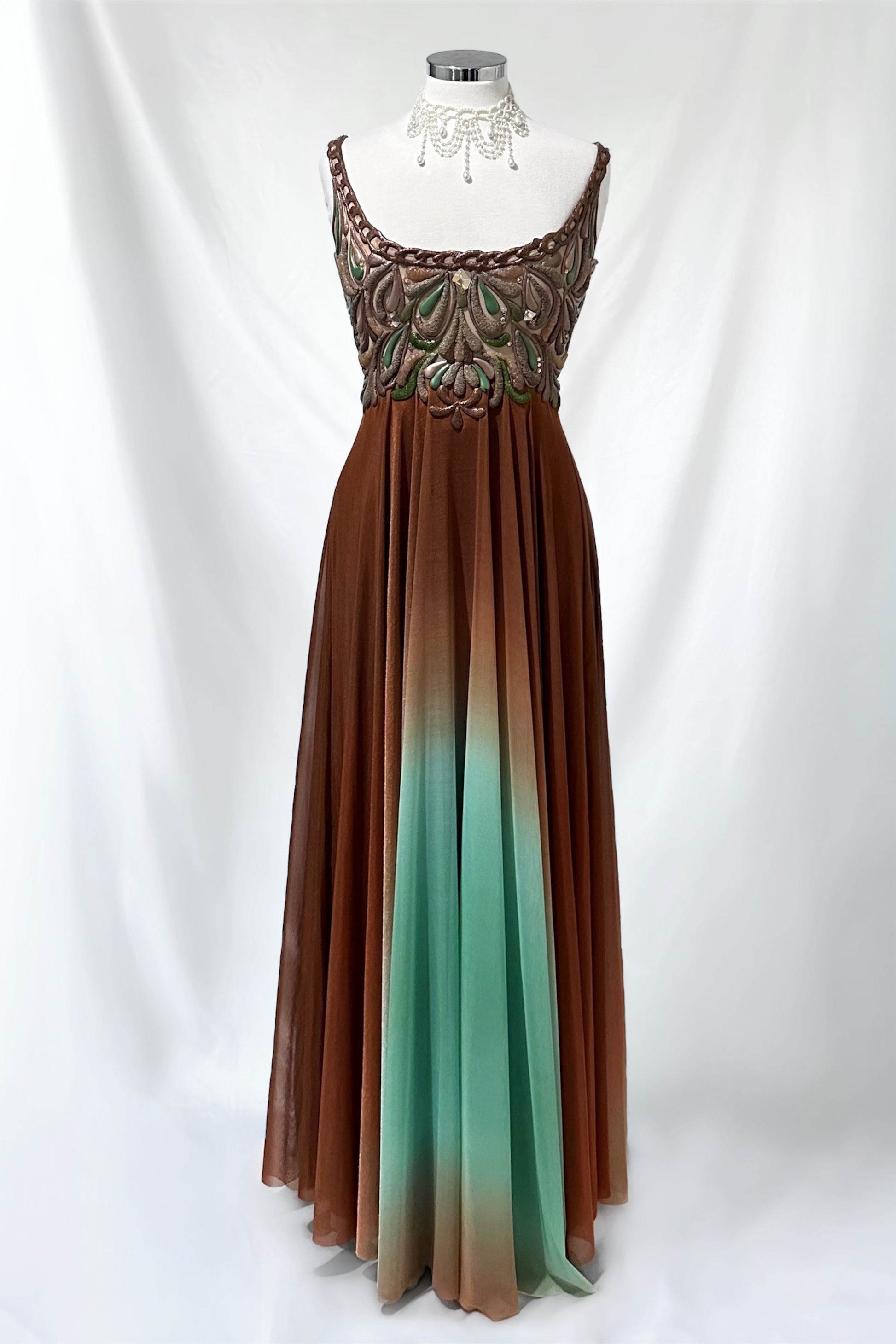 Enter a realm of wintery elegance with this Ema Savahl Couture gown, adorned with sparkling Swarovski crystals on the bust that glisten like icy stardust. The intricate, hand-painted details on the bodice bring a touch of elven magic, as soft hues of earthy brown and a frosty pastel turquoise cascade into a flowing skirt. This gown, with its ethereal quality, captures the essence of an enchanted winter elf forest, perfect for those seeking a truly captivating, otherworldly style.